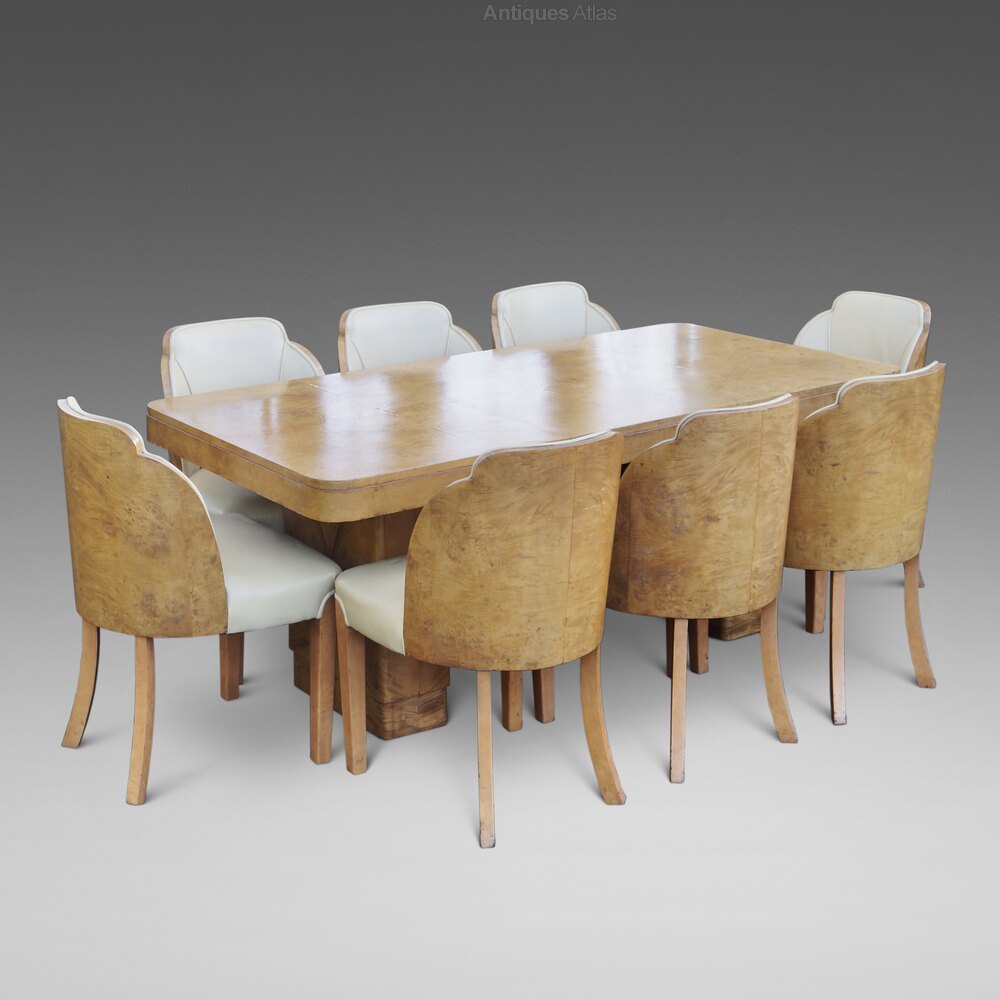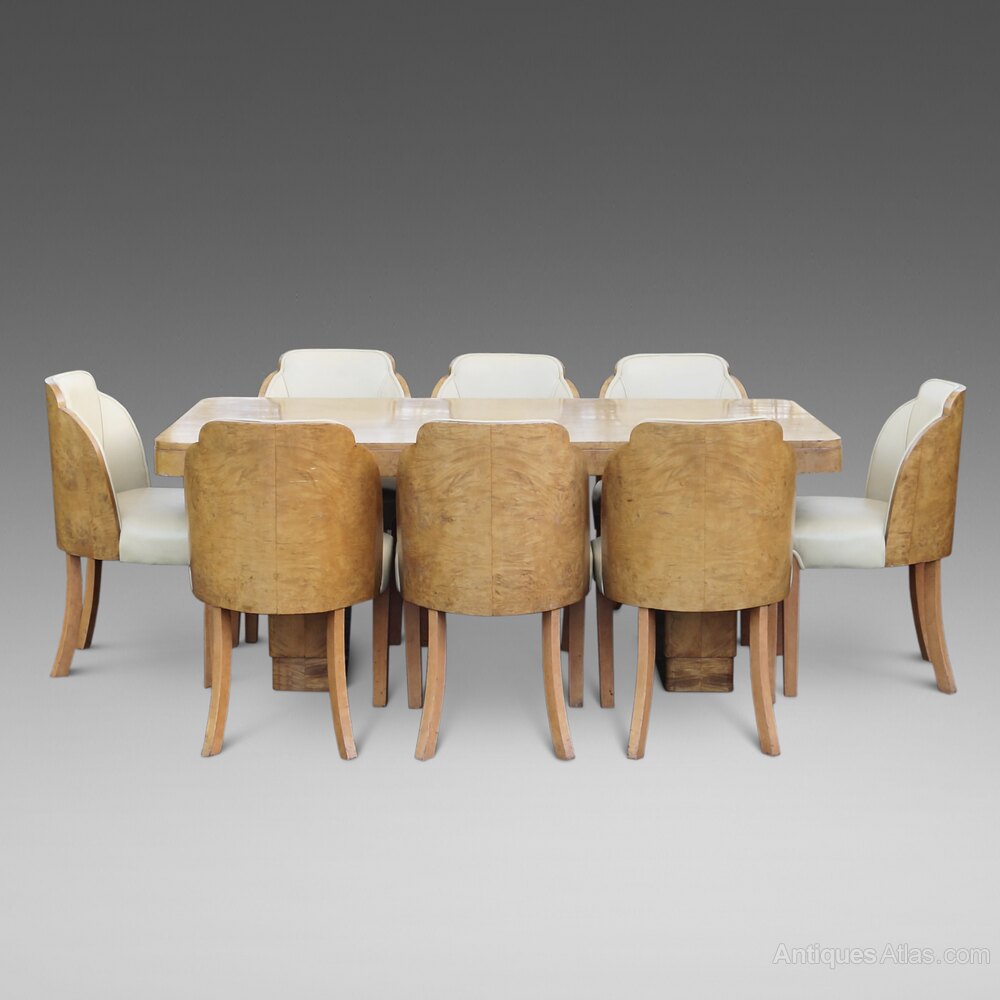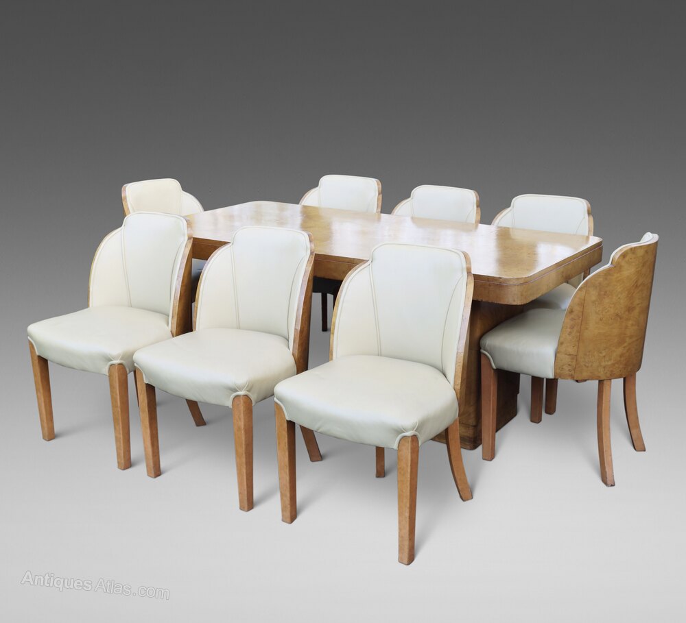 Harry & Lou Epstein Cloud Dining Suite in burr maple. Comprising of eight chairs, upholstered in cream leather and matching dining table with plate glass top. In original condition having been in the same ownership for the past 70 years. table dimensions 750mm high, 1830mm wide and 910mm deep. English. Circa 1935.