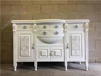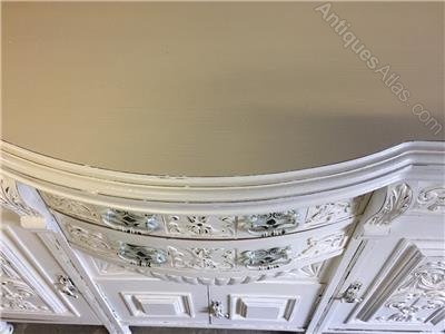 Hand painted in white and consisting of 4 drawers and 3 cupboards, the doors and fronts all decorated with foliate carving and furnished with pretty pressed copper / brass handles.