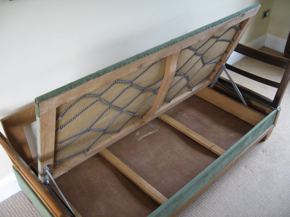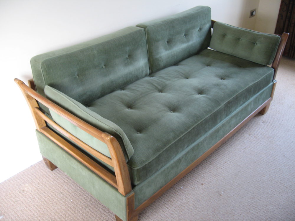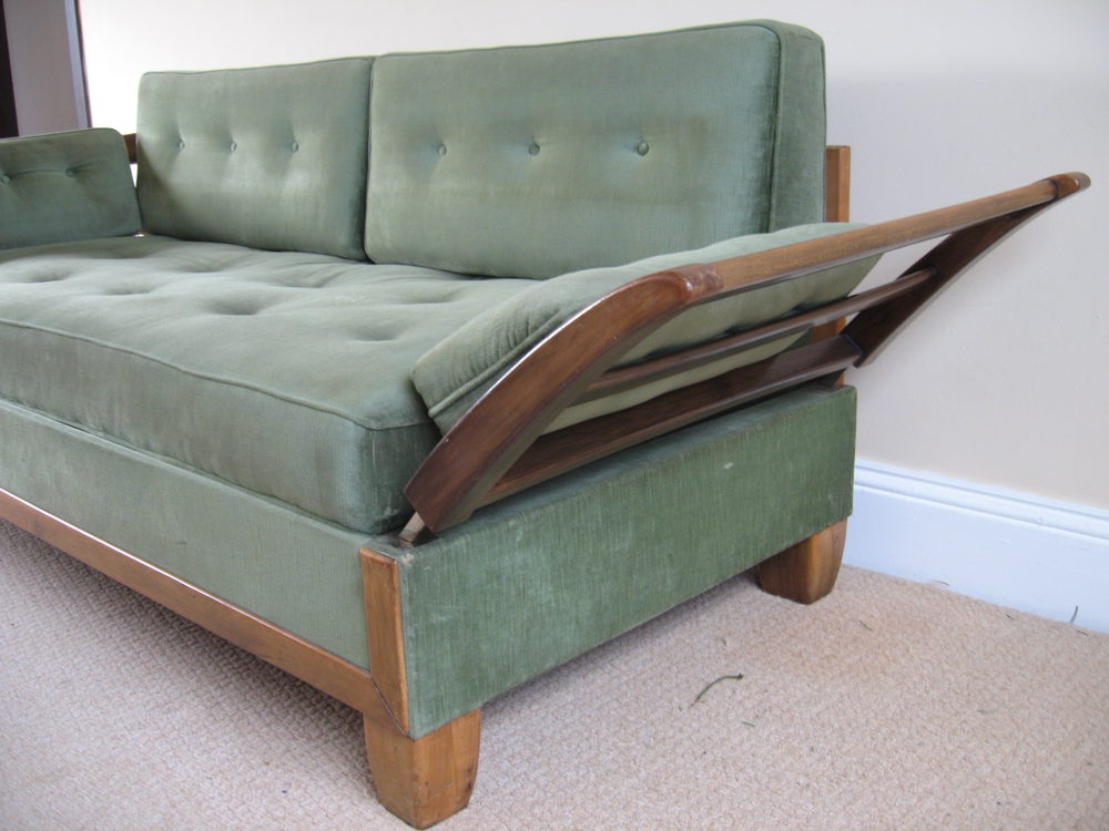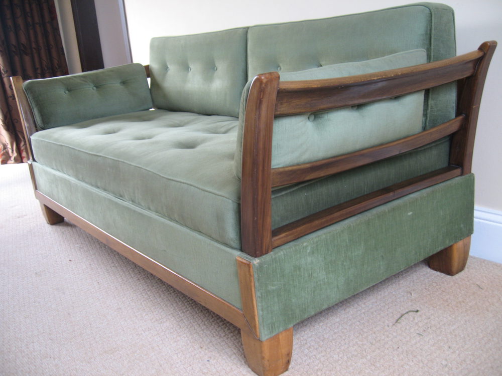 An early 19th century studio couch/settee with a lovely walnut frame and short stubby tapered feet. The end supports to this piece are removable should you wish to turn it into a daybed. Chromed fittings with a sprung base. Green dralon upholstered fabric.