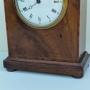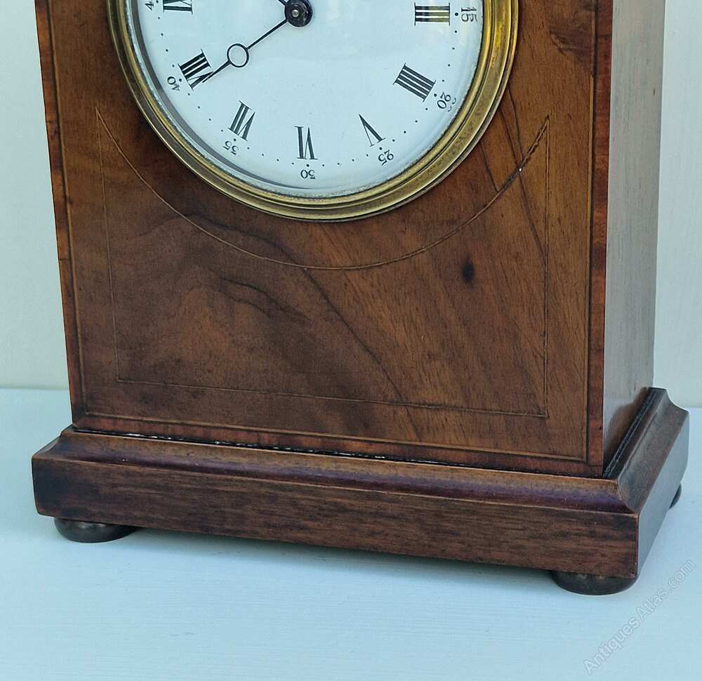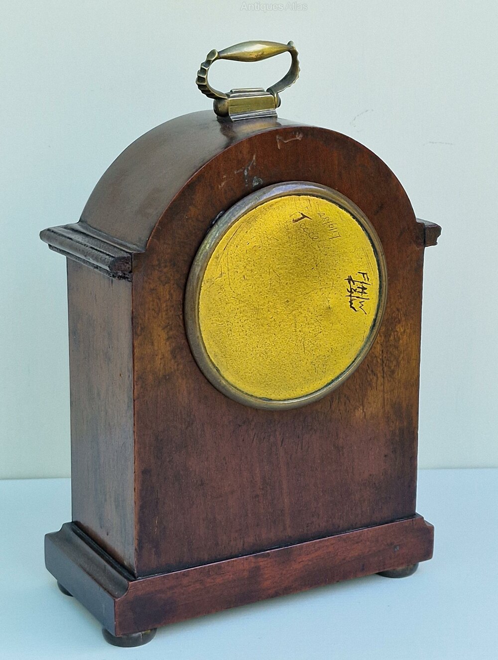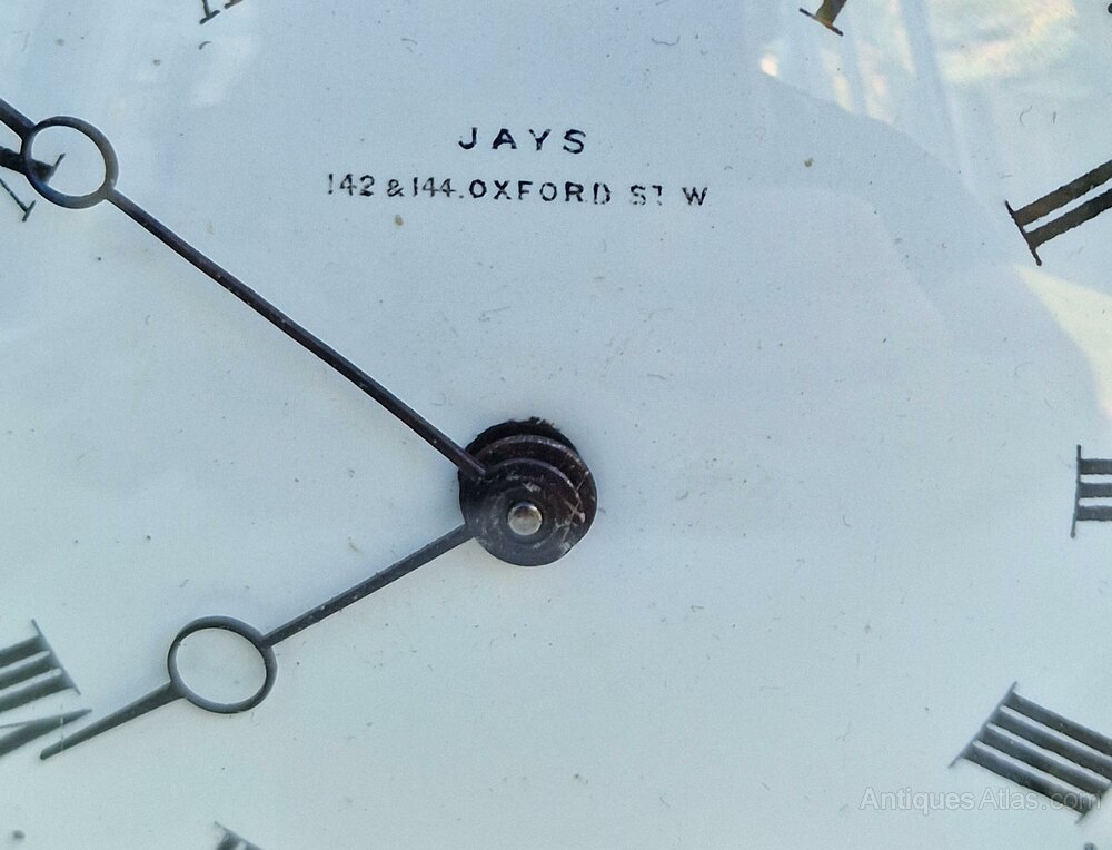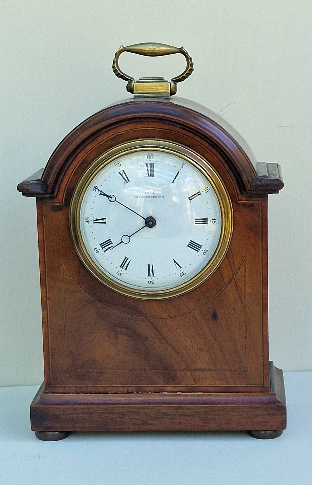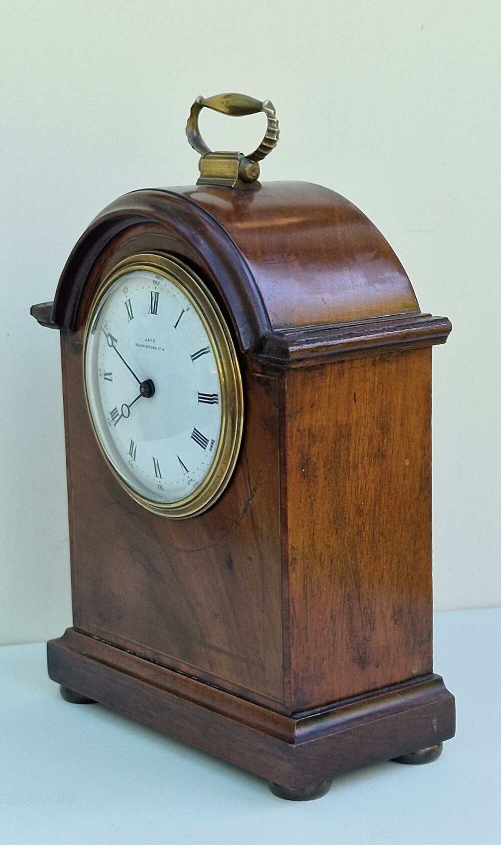 An Edwardian mantel antique clock of Georgian design. A mahogany case with line inlays to the front. An arched pediment and a brass top handle. Brass feet. A convex enamel dial with Roman numerals and blued steel 'moon' hands. Signed to the dial by retailers 'JAYS 142 & 144 OXFORD ST W' An 8-day duration timepiece mechanism. Circa 1910.