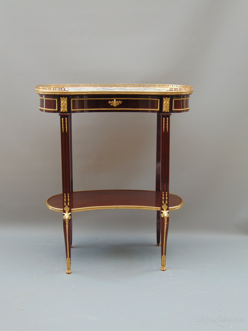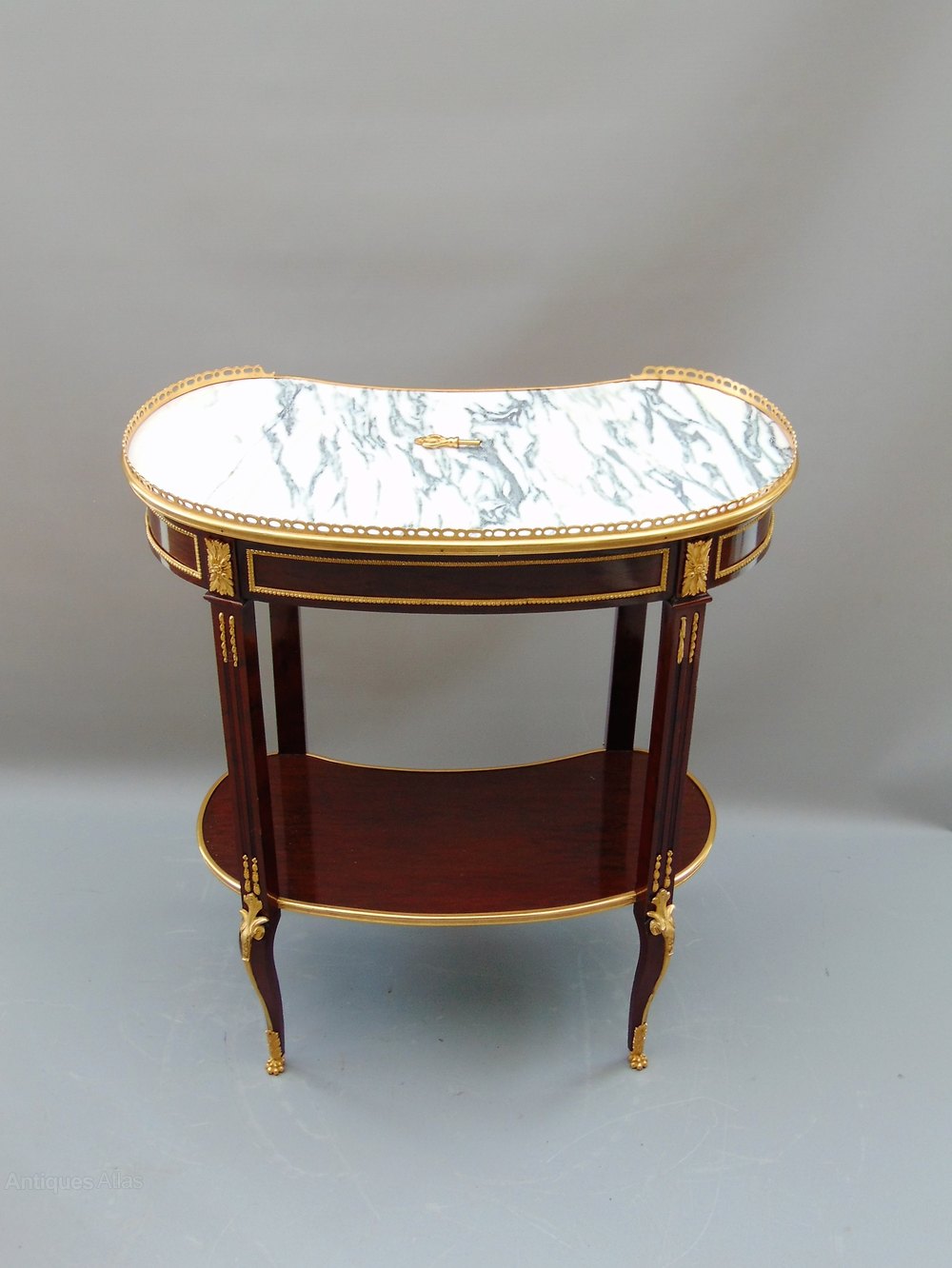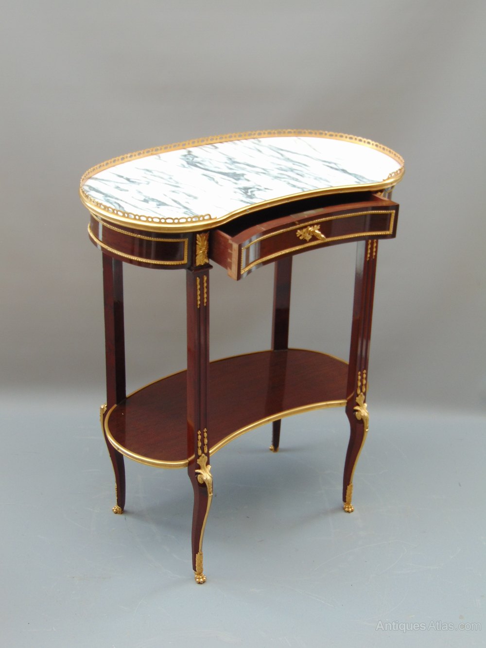 A fantastic elegant French Kidney Shaped Quilted Mahogany Side Table with Grey Veined Carrera Marble Top and high quality Ormolu mounts single freeze drawer which is Mahogany Lined and has fine Dove Tail joints standing on sweeping reeded legs joined by shelf stretcher .