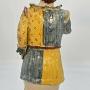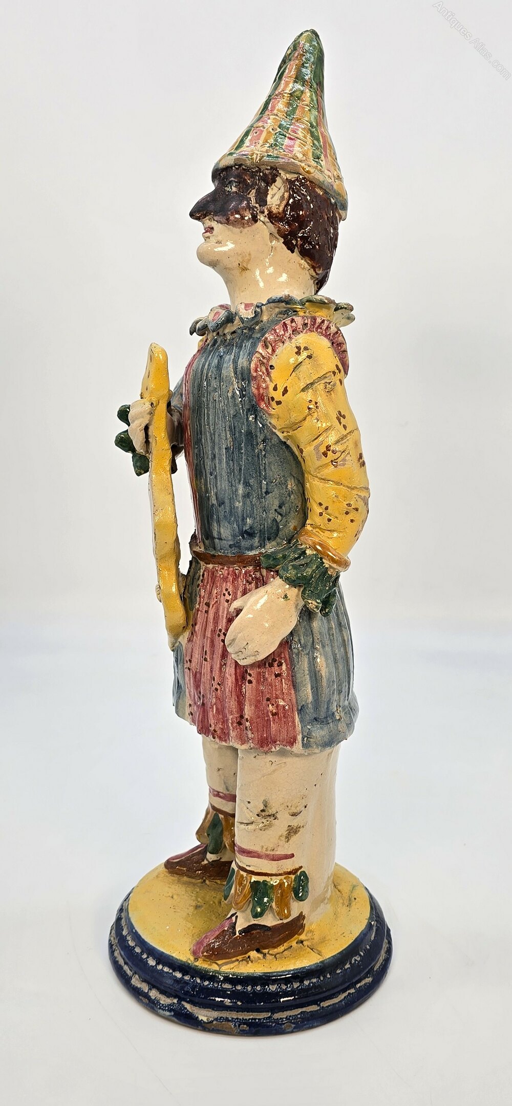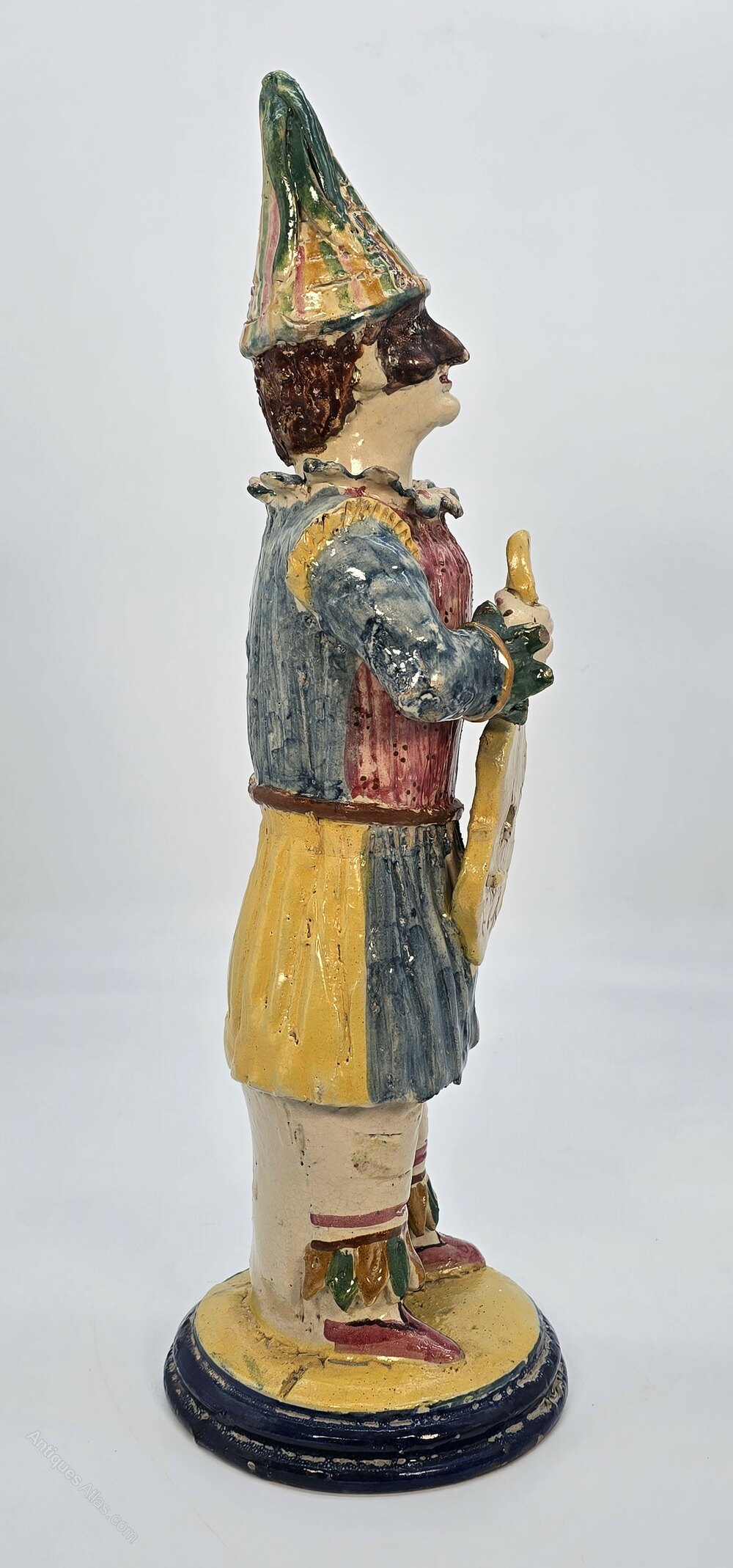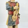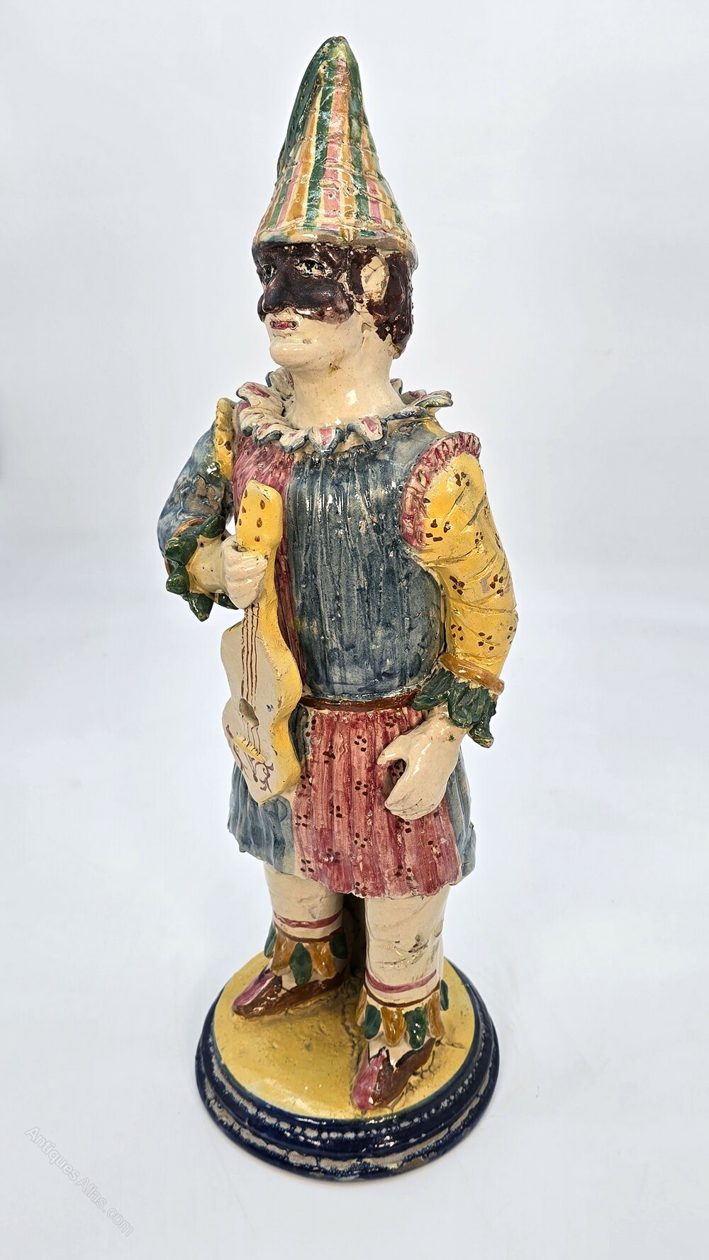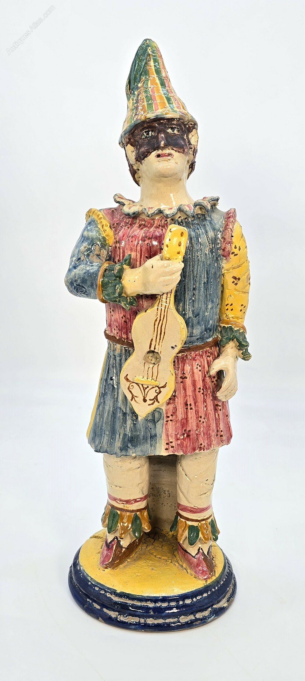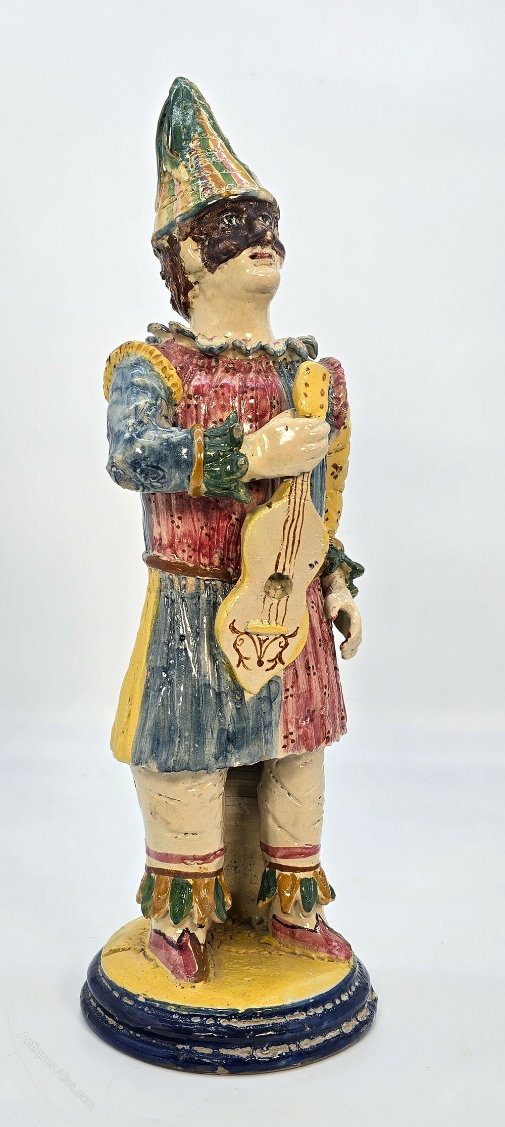 The male figure is humorously dressed in a bright and flamboyant performance costume which includes a high peaked hat and a partial leather face mask. He is holding an early stringed instrument, eager to entertain.