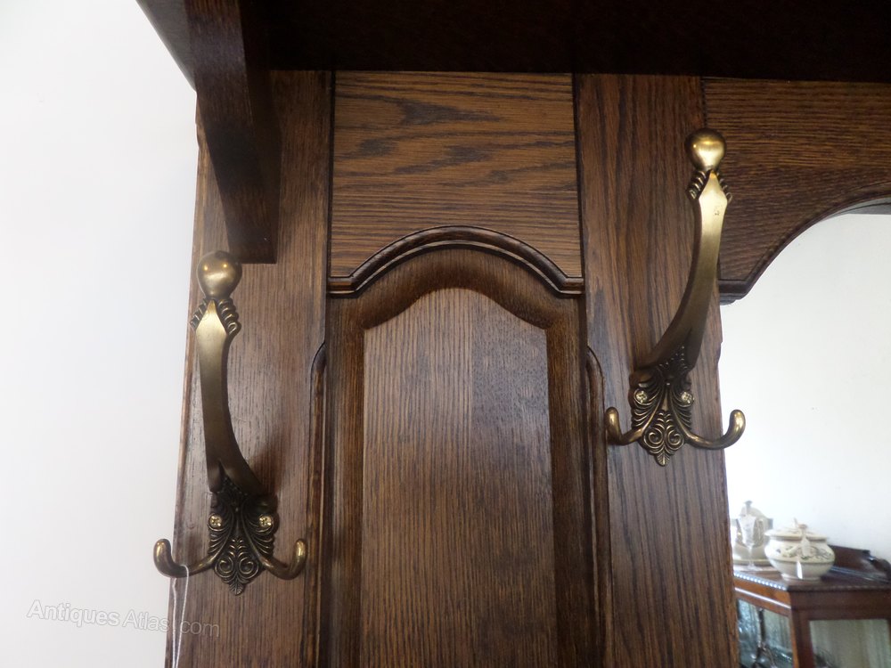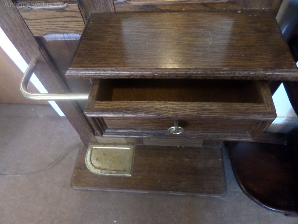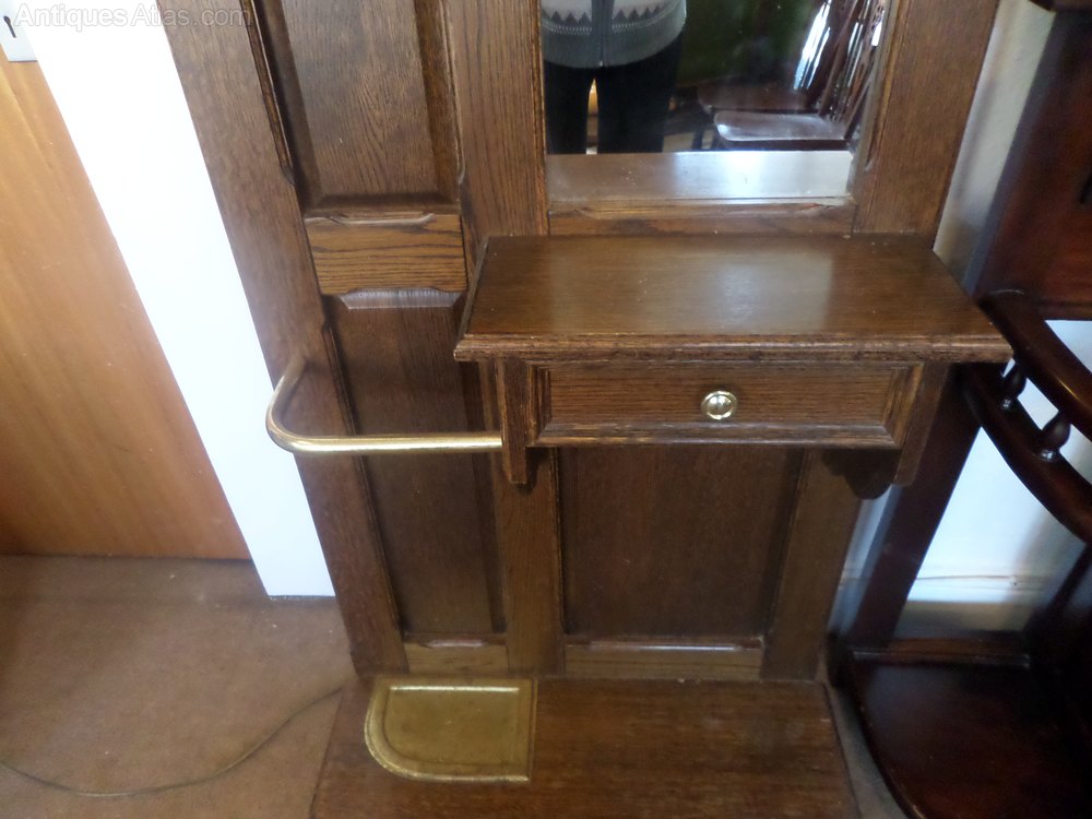 A small Hall Stand.Made of Oak with Good Brass Hooks. From the 1920's It has a drawer for Gloves etc. and a Single Drip Tray for wet Umbrellas. It Measures: 6 feet 7 inches high---2 feet 3.5 inches wide and 11 inches in depth. A nice item for the smaller house.