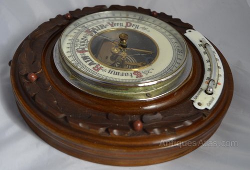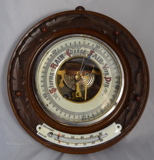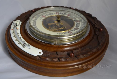 An Edwardian walnut small barometer. A well carved case and a visible mechanism to the enamel dial. A curved thermometer and enamel scale. Circa 1905.