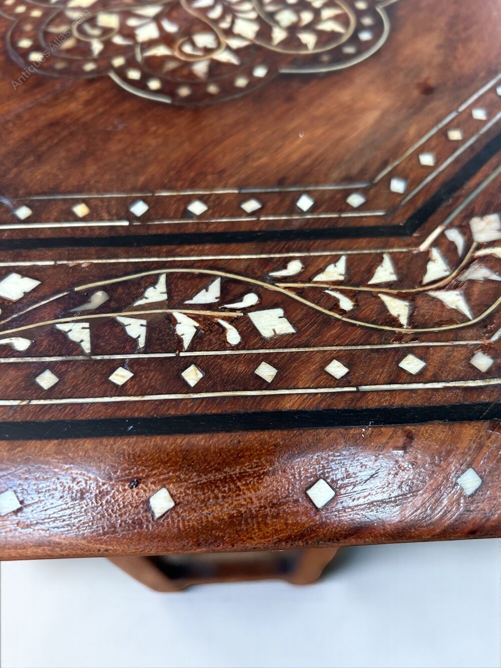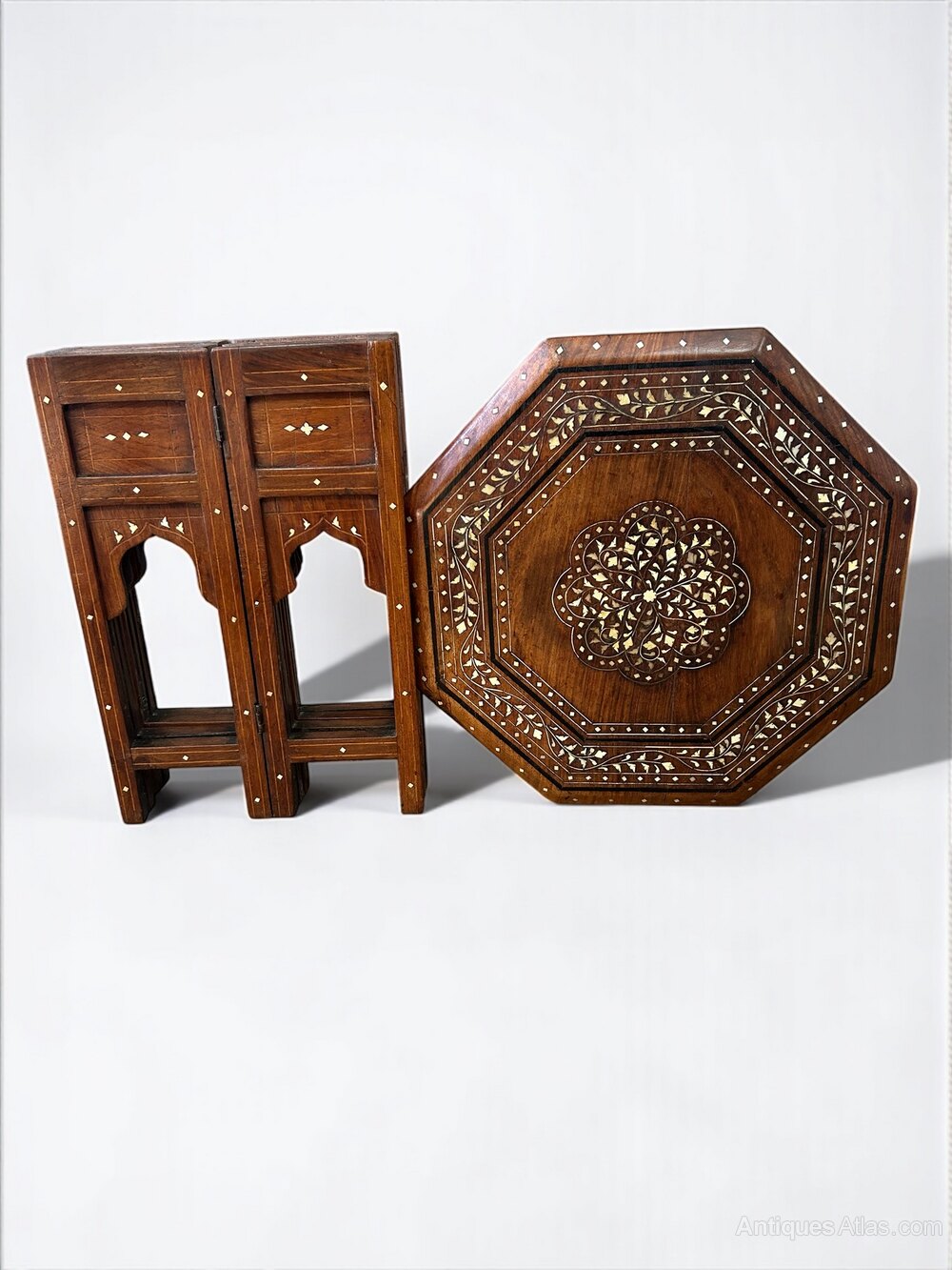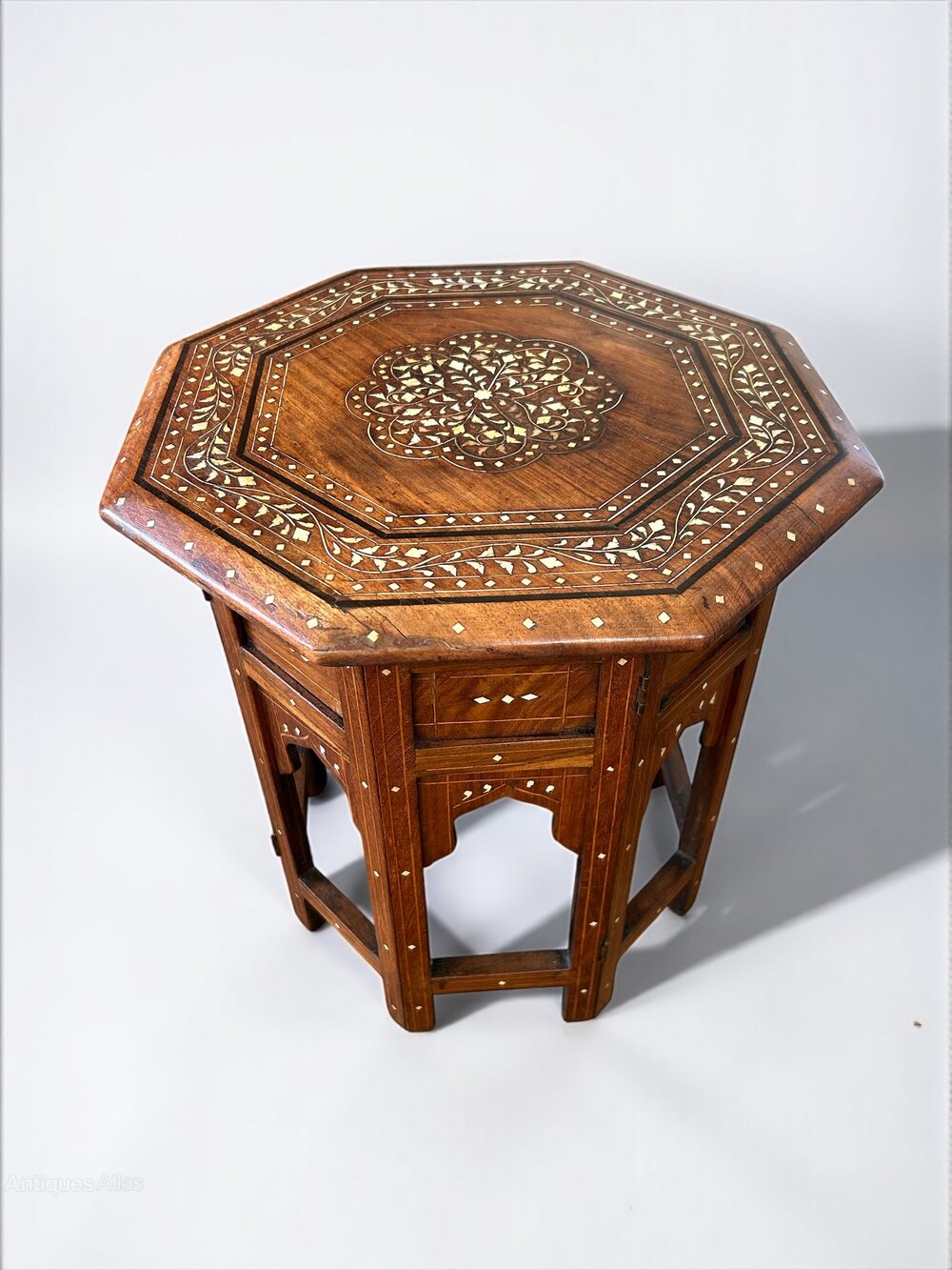 Anglo Indian Hoshiapur octagonal table circa 1880, profusely inlayed with bone and an ebony stringing line to the perimeter, the eight sided base each has an inset panel and below shaped myriads. The table is a pleasant light honey colour and in very good condition.
