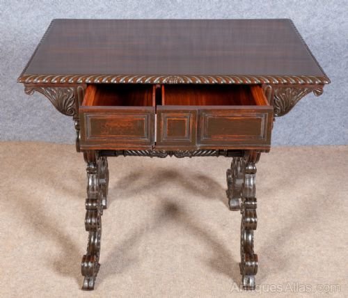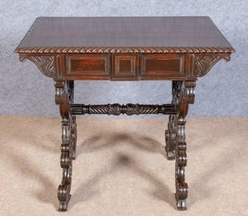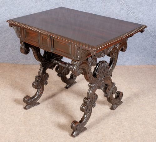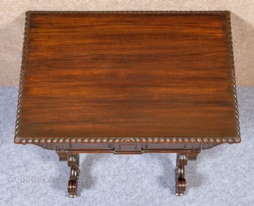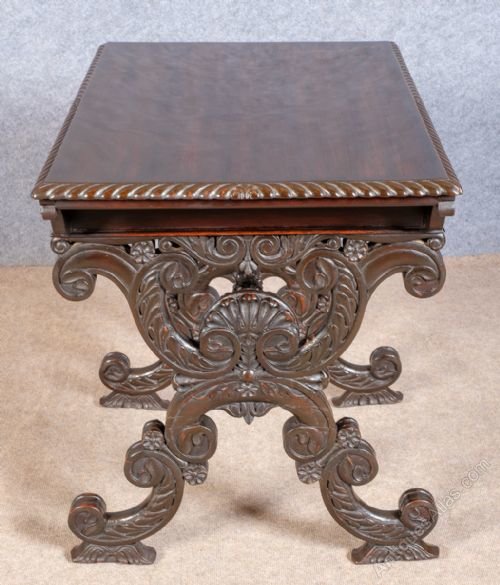 A good heavy quality antique hand carved Anglo Indian freestanding padouk wood table. The rectangular shaped top having a wonderful carved gadrooned edge. The 2 frieze drawers having chamfered and panelled fronts with dummy drawers to the back. The heavily carved “X’’ frame ends with “C” scrolls, acanthus and patrae all joined with a spiral twisted cross stretcher. Dimensions:- Height…29.25’’/ 74.5cm. Width…34.25’’/ 87cm. Depth…24’’/ 61cm. Delivery to most of U.K. mainland £55.