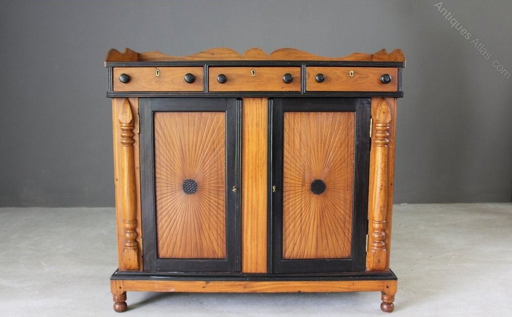 Anglo Indian Side Cabinet. Late 19th Century Indian satinwood cabinet, banded and moulded with ebony, the top with a wavy three-quarter gallery above three drawers within reeded mouldings over a pair of panelled doors incised with sun bursts flanked by split arrow-headed pilasters on turned feet.
