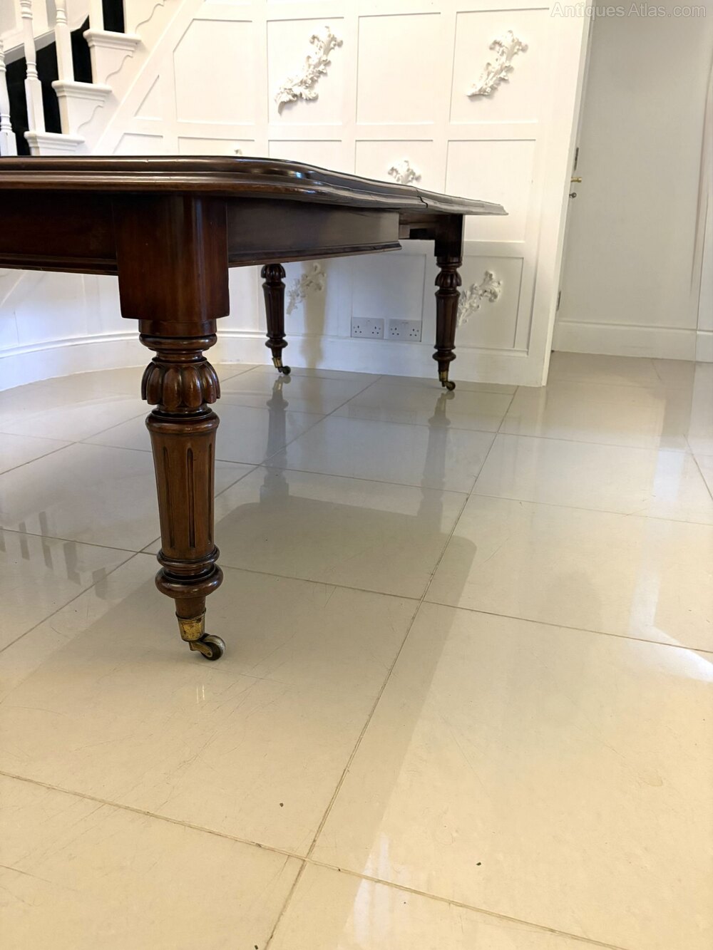 Antique Victorian 10 seater quality figured mahogany extending dining table having a quality figured mahogany top with a moulded edge and two original extra leaves, original winding mechanism and handle standing on glorious reeded carved tapering legs with original brass cup castors