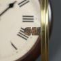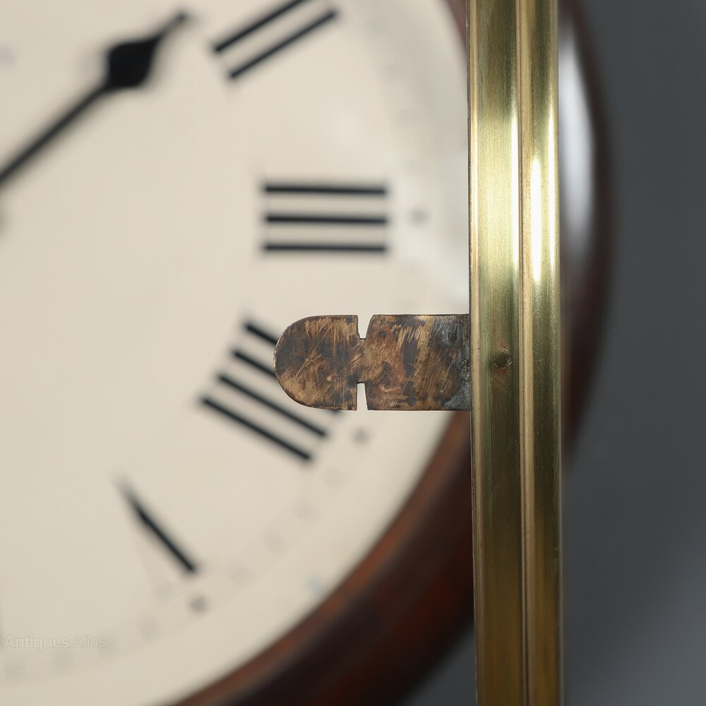 The mahogany wall clock, incorporates a replacement tin dial, painted with black Roman Numerals, with an elegant shaped hour and minute hand. A hinged solid brass bezel houses the glass face that protects the tin dial and face whilst in operation. The brass bezel opens on a right-hand hinge to allow you to adjust or set the time. There is a catch to the back of the clock that locks the brass bezel in place and stops it from accidentally swinging open.