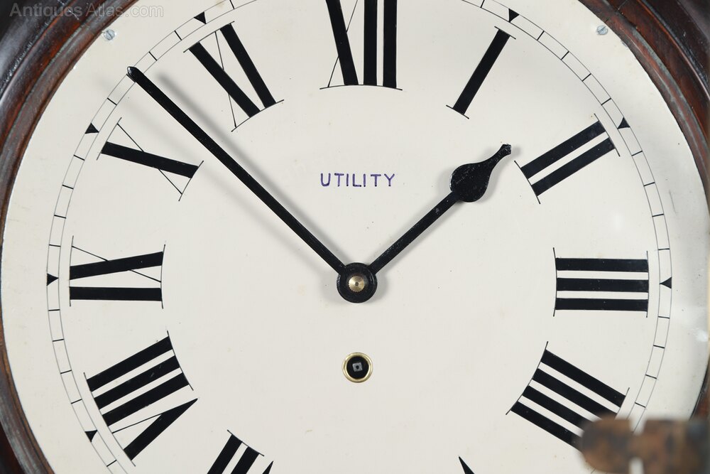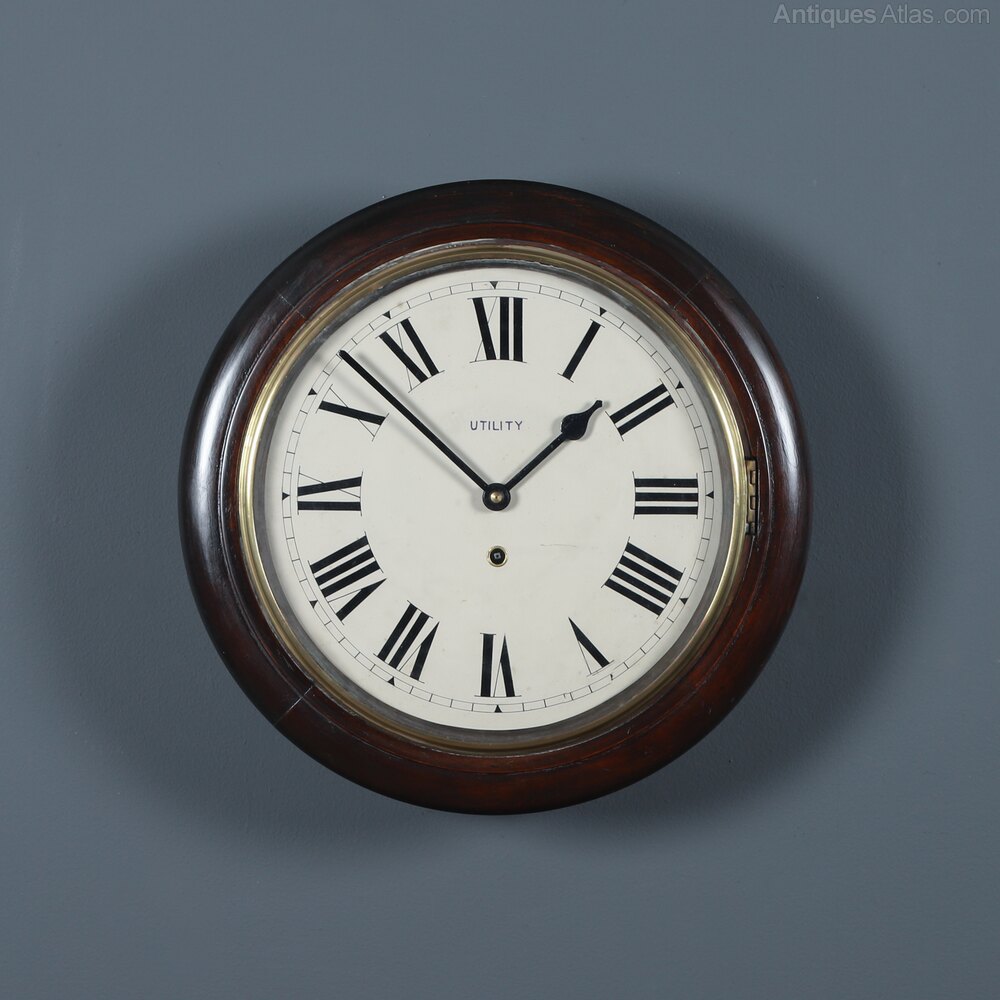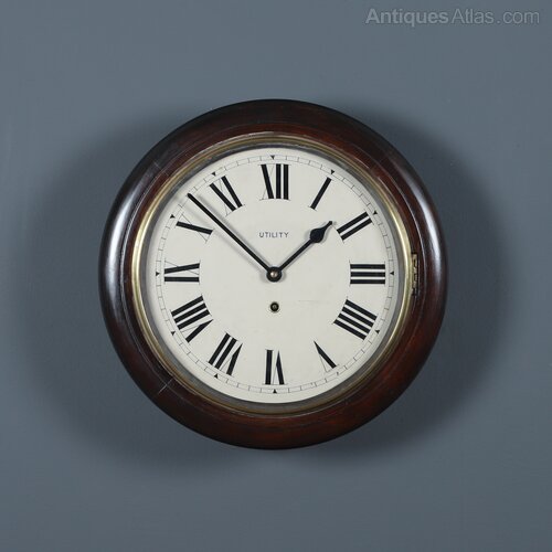 This is a good quality antique 15½” Utility mahogany wall clock, with a railway station design, incorporating a timepiece mechanism, circa 1930, which has been lovingly restored to its former glory and is now in good working order.