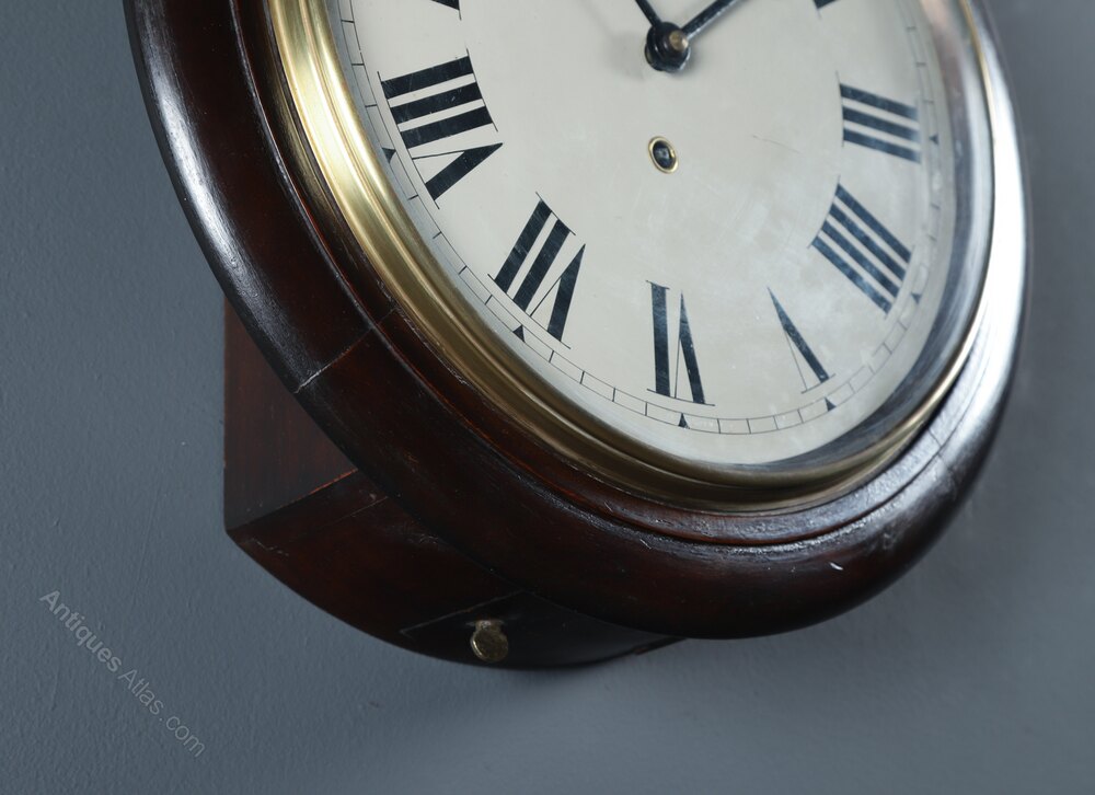 The deep-dish mahogany case has been French polished to revive the wonderful colour and patination of the grain in the timber. On the back of the clock is a bracket to attach the clock to the wall.