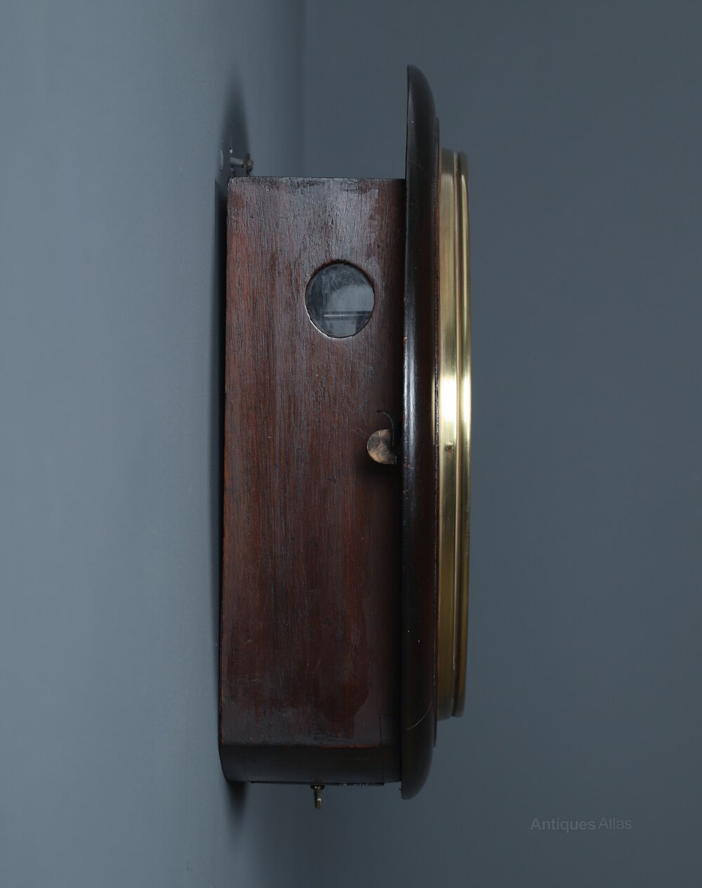 This mahogany wall clock boasts a beautiful mahogany case, with a moulded brass bezel, a pendulum access door on the underside and a “port-hole” viewing window on both sides of the clock, where you can view the mechanism.