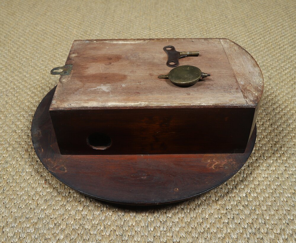 The mahogany wall clock, houses a quality single brass barrel spring driven timepiece movement. A timepiece mechanism is not designed to chime or strike. The movement has been restored and serviced and is now in good mechanical order, ensuring this clock is reliable and keeps good time. The pendulum length, which is attached to the mechanism by accessing the clock from the door below, can be adjusted to allow you to regulate the speed of the clock. The clock comes with a key, which is used to wind the mechanism through the centre of the face dial.