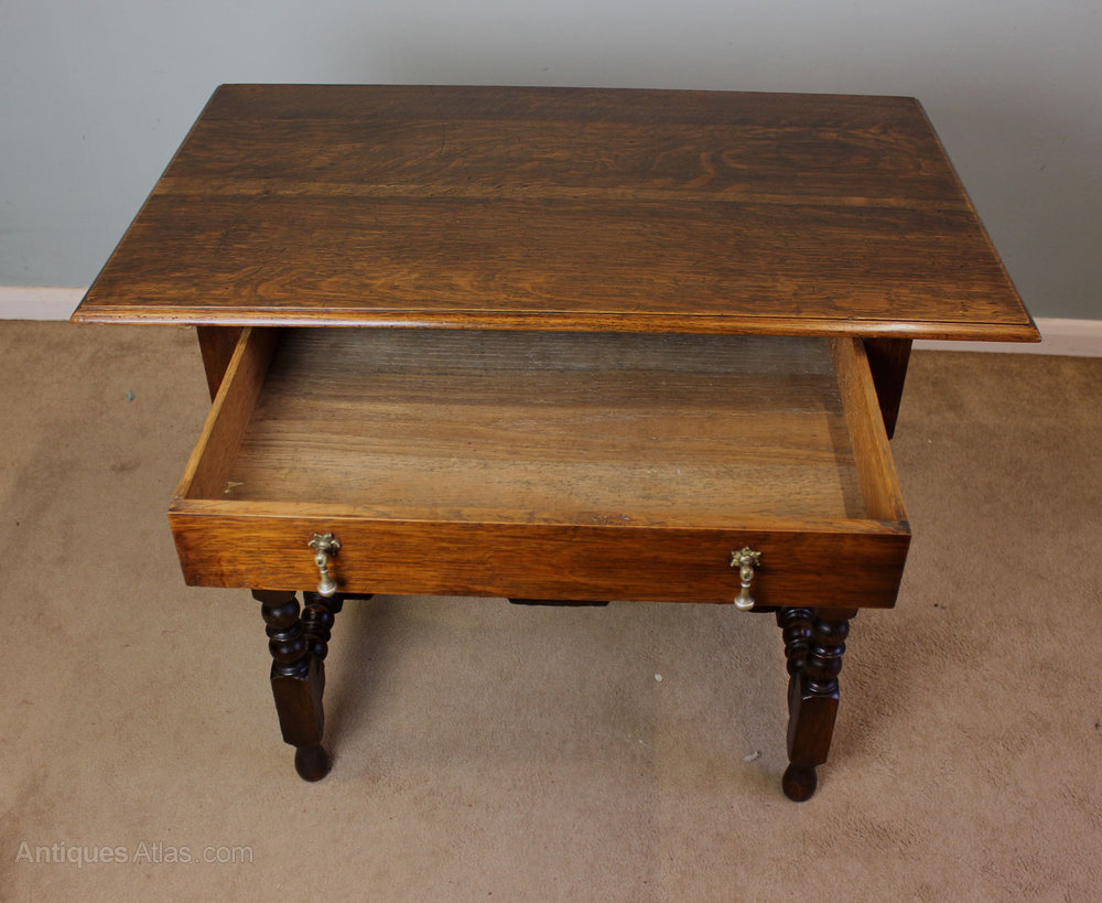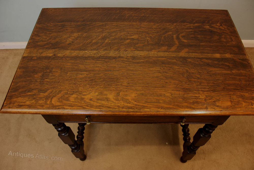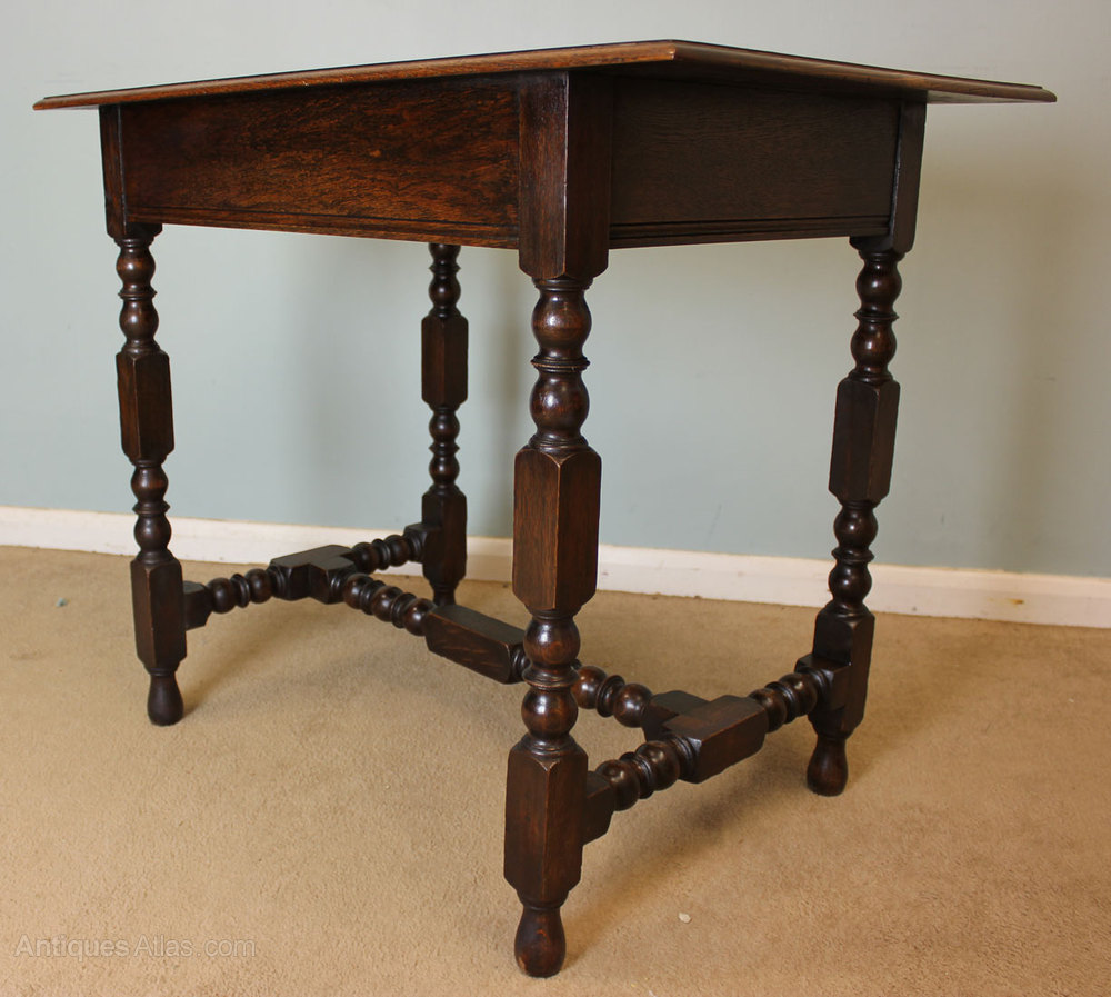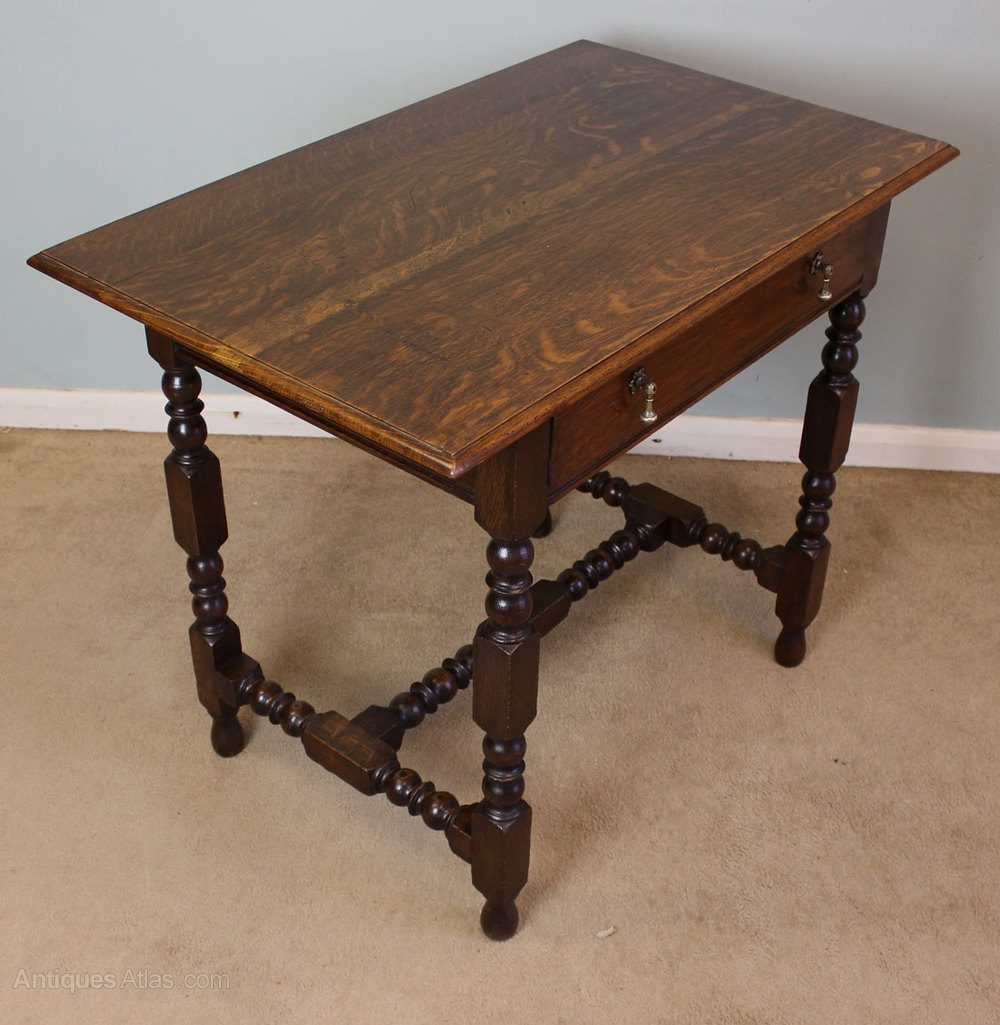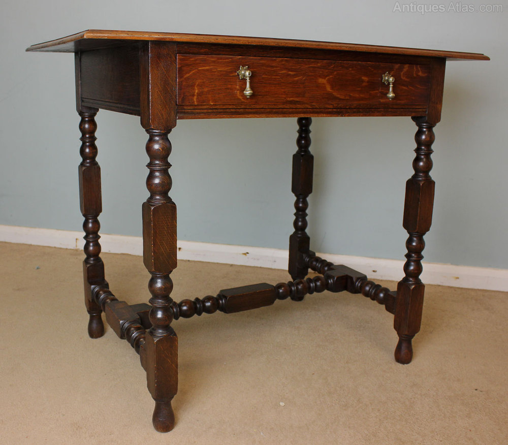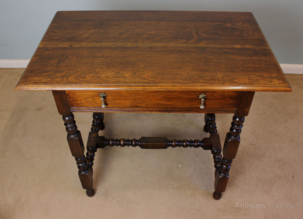 Antique Oak Side Table, This antique 18th century style oak side table dating from Circa 1910 it has a moulded edge top with a single drawer under with brass drop handles, and standing on turned base joined by stretcher.