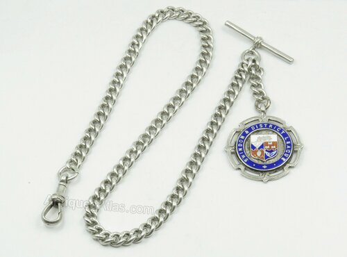 The chain comes with a 1930s silver and enamel fob from the Swindon & District (football) League, engraved on the reverse Div 2a, 1932-3.