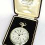 The signed dial has an inner 24 hour dial, two subsidiary dials (one for constant seconds and the other to record up to 30 minutes), and an outer 0-300 scale which is a classic feature on English navigation chronographs. There is a small old patch of damage at the bottom of the dial.