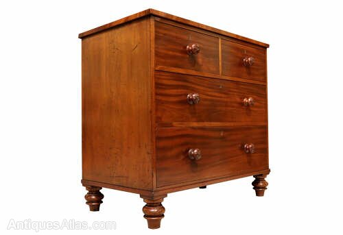 This beautifully restored 19th-century mahogany chest of drawers is in excellent condition, showcasing the rich colour and grain typical of fine Victorian craftsmanship. Featuring two short drawers over two long drawers, it retains its original turned wooden knobs and stands on elegant bun feet.
