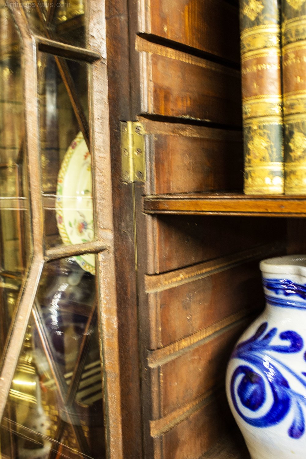 The shelves to the cabinet are all original, wide boards of pine faced with mahogany moulding. They are removable and can be adjusted. There are 3 shelves to each section (The wings shown in the photo have only 2 each in use)