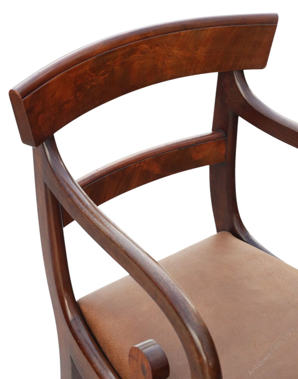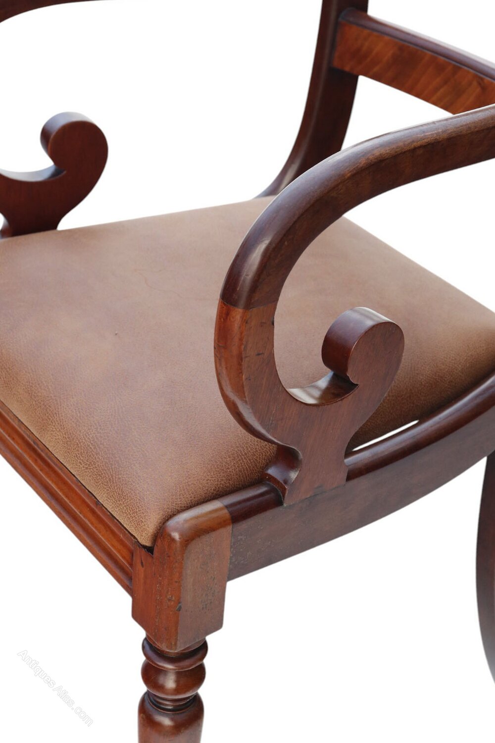 A rare opportunity to acquire a Georgian-inspired 19th century mahogany scroll-arm carver chair, offering both elegance and practicality for a range of interiors. Sale up to 30% off marked prices