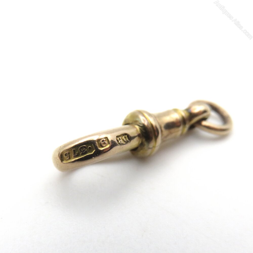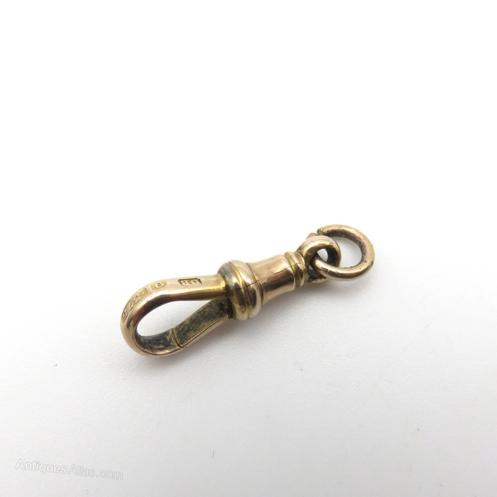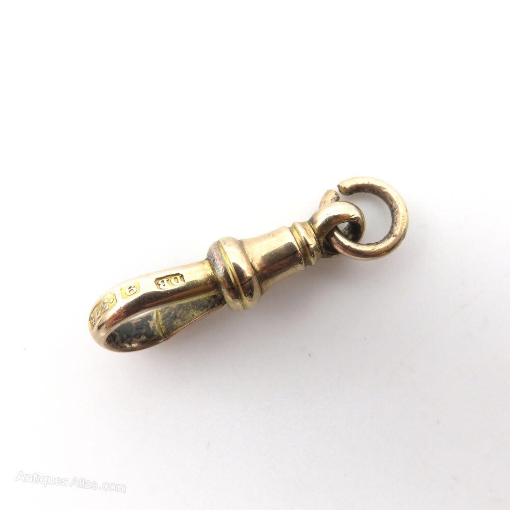 A good sized (22mm excluding bail) dog clip in 9ct gold. It has a lovely warm, rose tint, and is marked DB and 9/375 for 9 carat gold. These marks are lovely and crisp, indicating that it has not had too much wear in its life.