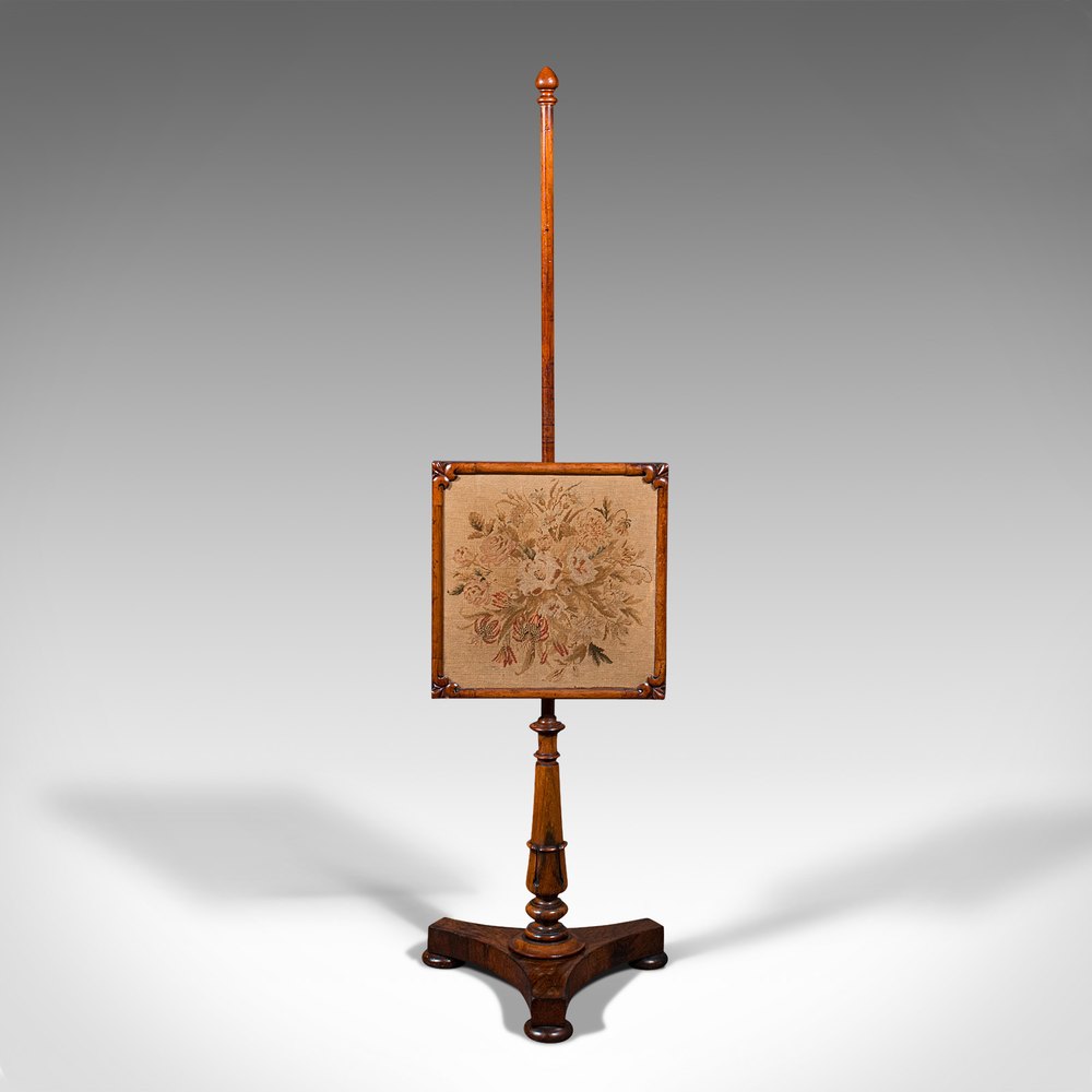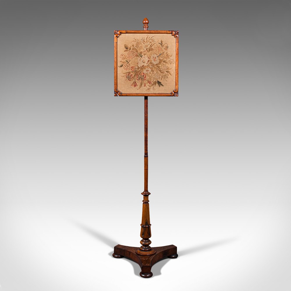 This is an antique adjustable pole screen. An English, Rosewood fireside screen with tapestry panel, dating to the Regency period, circa 1820.