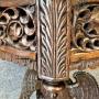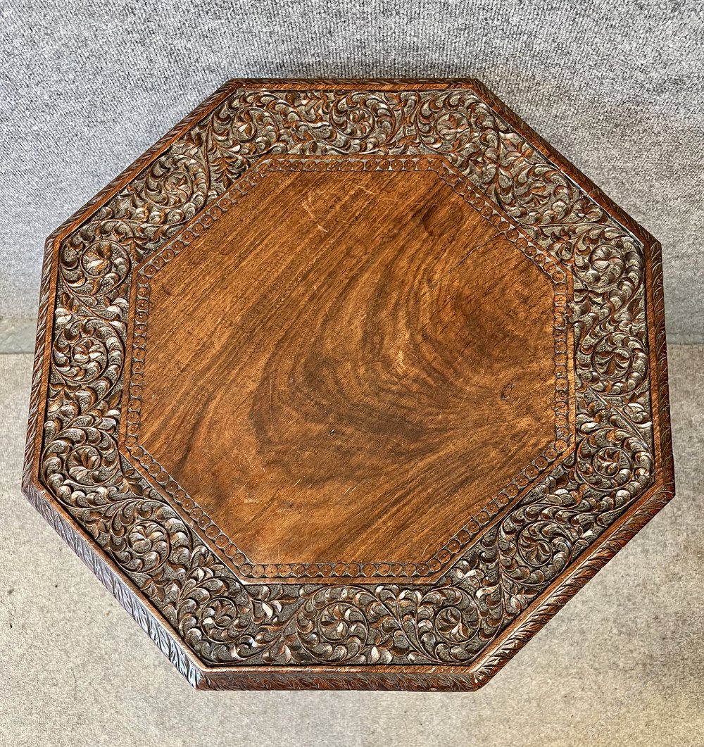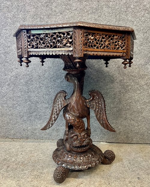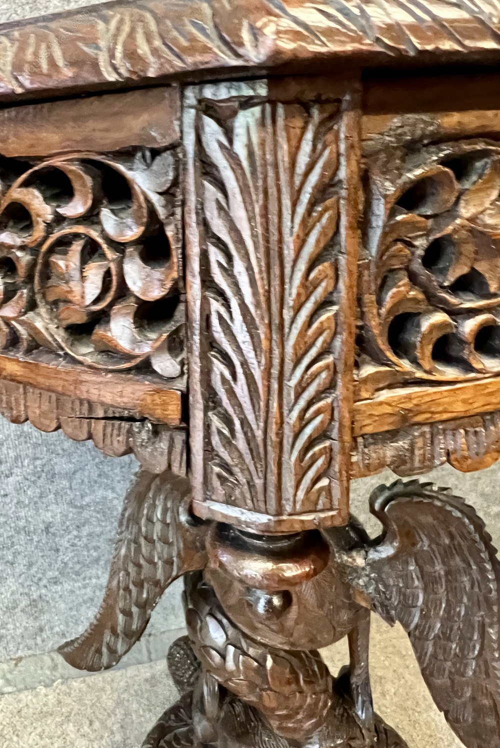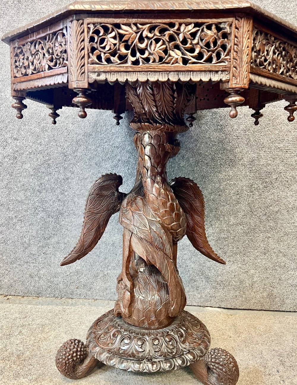 A good 19th.Century Anglo-indian profusely carved Padouk wood table. The hexagonal top having carved detail above the pierced and carved frieze with turned finials below. The ornate well carved pedestal having a winged bird entwined by a serpent and standing on the carved head of a tiger. The circular carved base supported on carved 3 carved fruit. Condition- good with one or two old repairs to the bird’s wing. Colour and patina original. Dimensions:- Height…28.5’’/ 72.5cm. Diameter…23.5’’/ 60cm. Delivery to most of U.K. mainland £50.