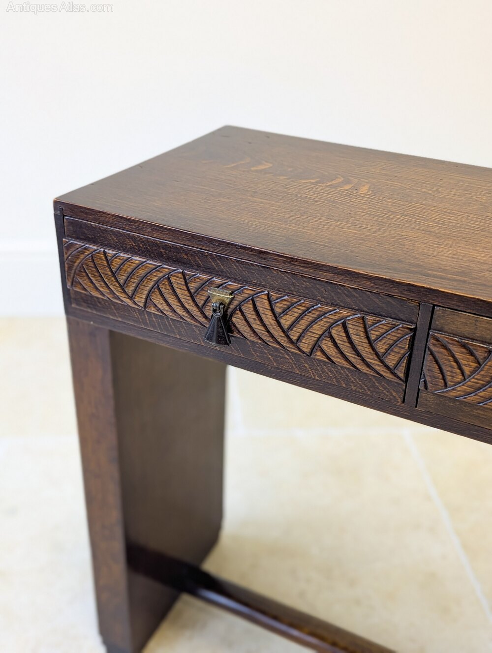 A stylish Art Deco oak side table of boldly geometric form. The rectangular top sits over a frieze of two drawers supported on slab sides and joined by a low stretcher. The drawer fronts are crisply carved with a repeating motif and fitted with original Deco drop handles.