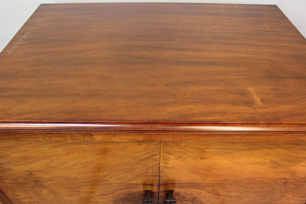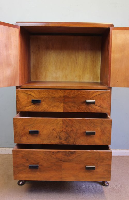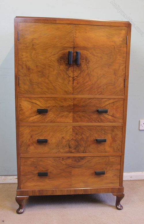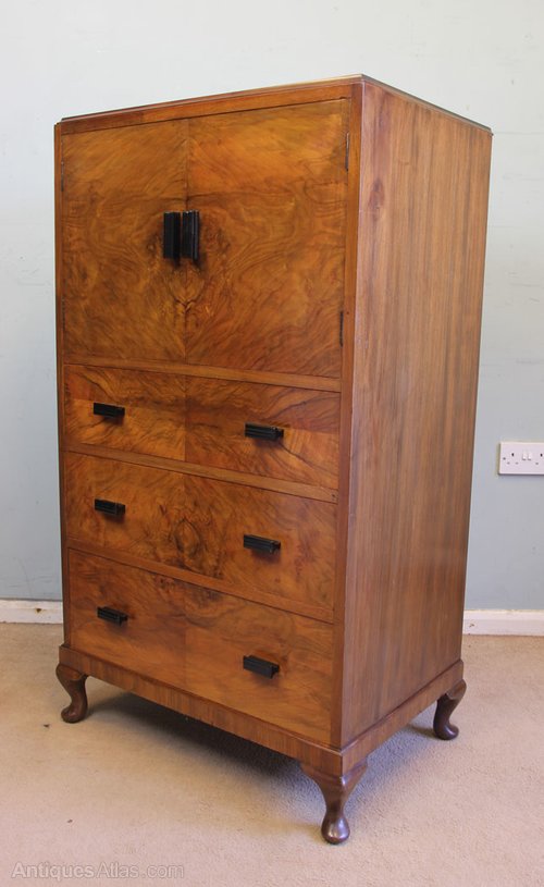 Antique Art Deco Style Figured Walnut Tallboy. This lovely figured walnut tallboy / cabinet /chest of drawers has a lovely walnut top with moulded edge under having two cupboard doors with three graduated drawers under all having lovely figured walnut fronts. The cupboard doors and drawers are fitted with art deco style handles the whole piece is standing on short cabriole legs.