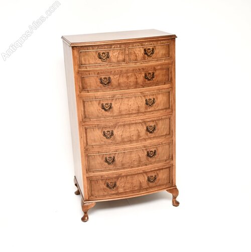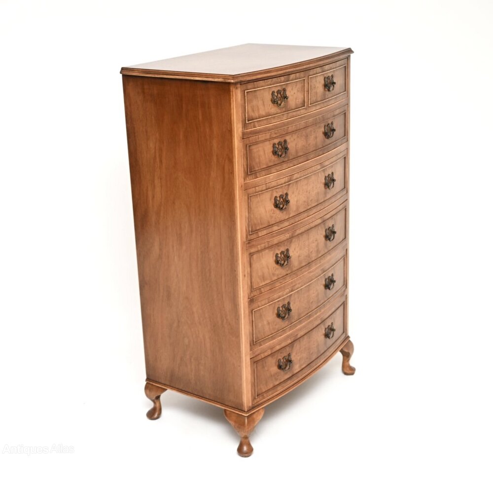 The quality is amazing, this has beautiful burr walnut grain patterns throughout. It is tall and slim, with a bow shaped front, sits on cabriole legs and has original brass handles.