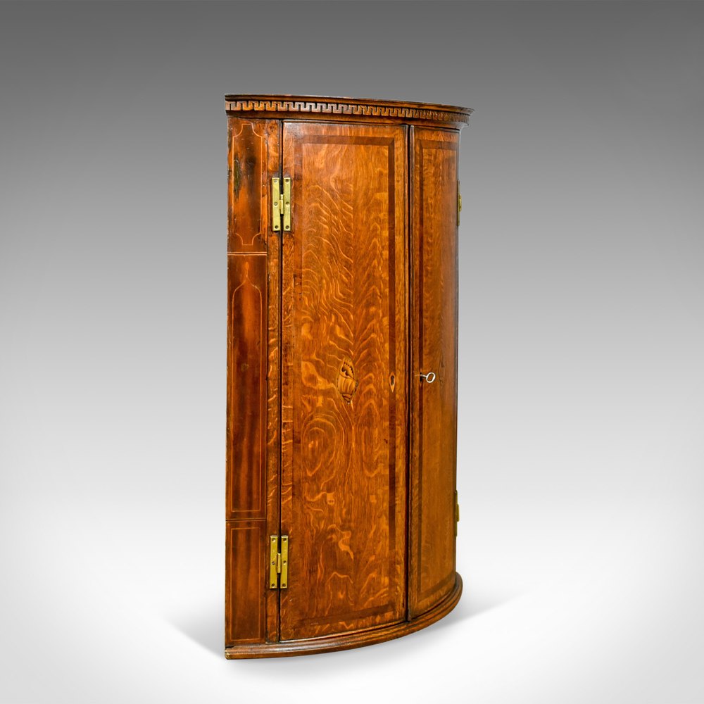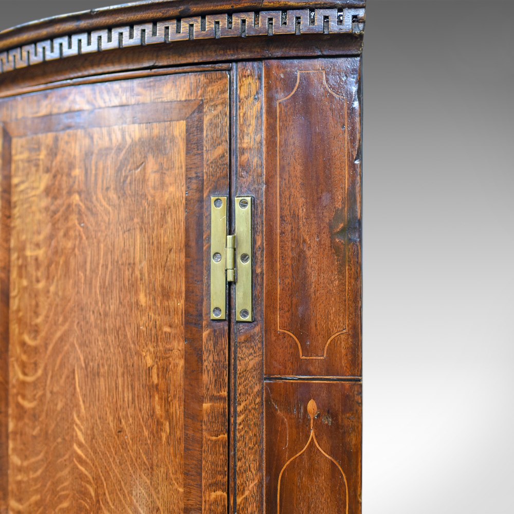 This is a fine example of an antique bow fronted corner cabinet, an English, Georgian, oak hanging cupboard dating to the mid eighteenth century, circa 1770.