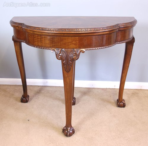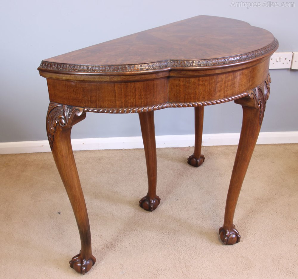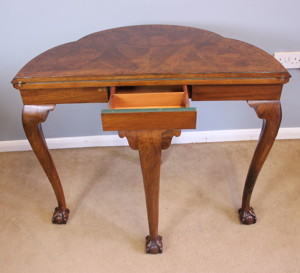 Antique Burr Walnut Card Games Side Table. This wonderful shaped burr walnut card / games / side table has a lovely burr walnut shaped top with carved edge detail the top opens to reveal a lined baize top the baize has been done for a time but is in good condition. The table is all supported by queen anne style legs with carved detail to the top of the legs and ball and claw feet.