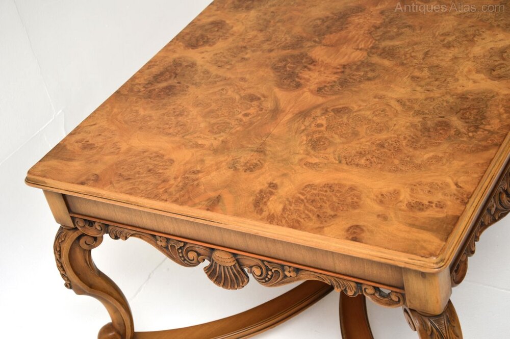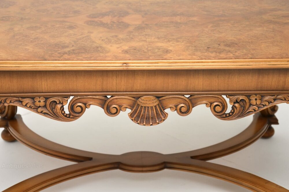 The quality is outstanding, this is a large and impressive size. The top has stunning burr walnut grain patterns, and there is crisp floral carving all around the edges. This stands on cabriole legs with more lovely carving at the knees, terminating in scrolled feet which stand on an X frame stretchered base.