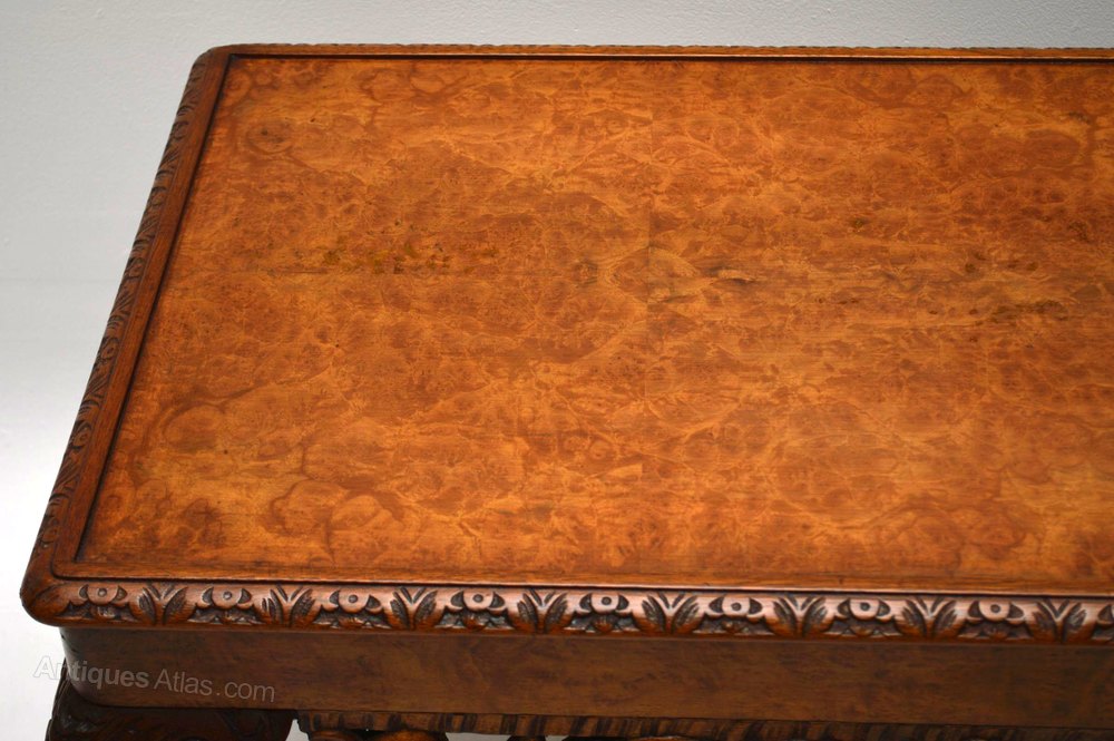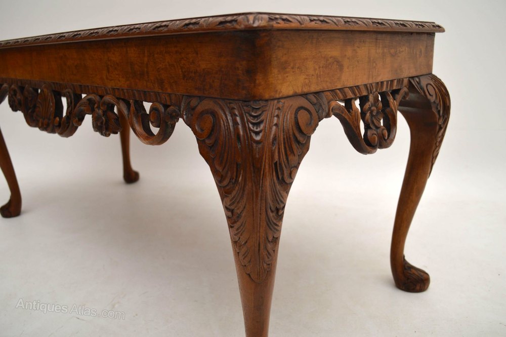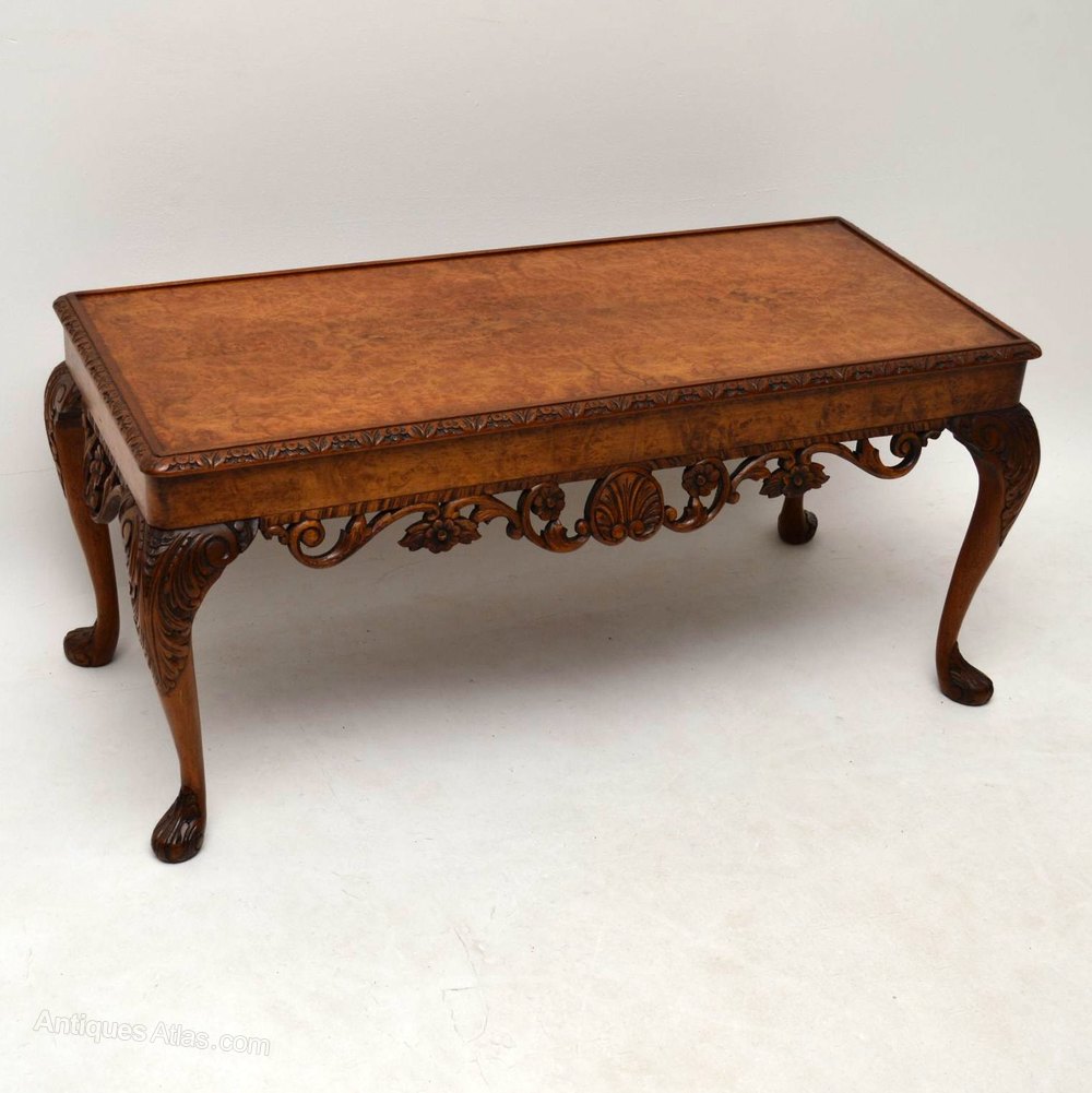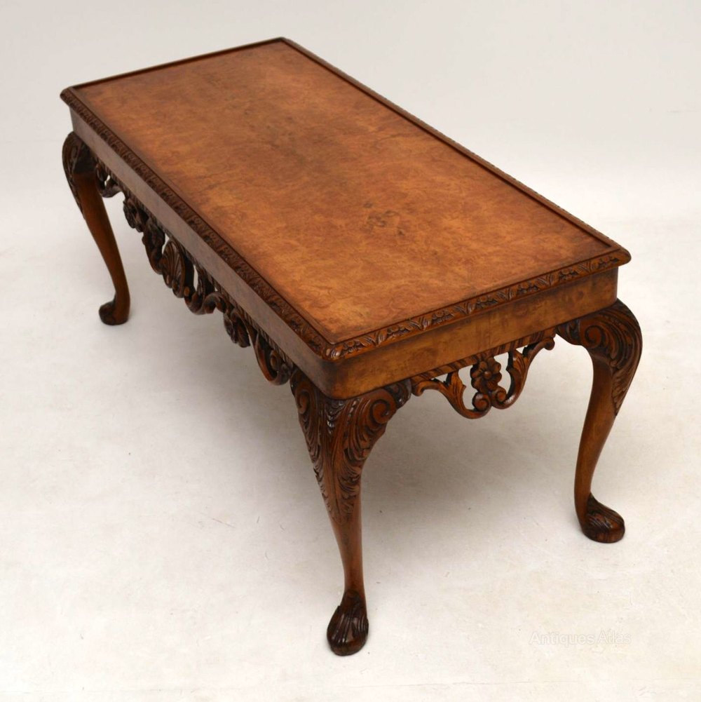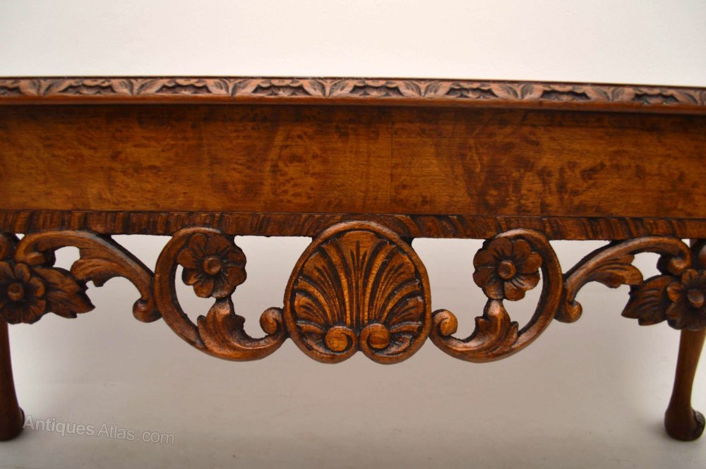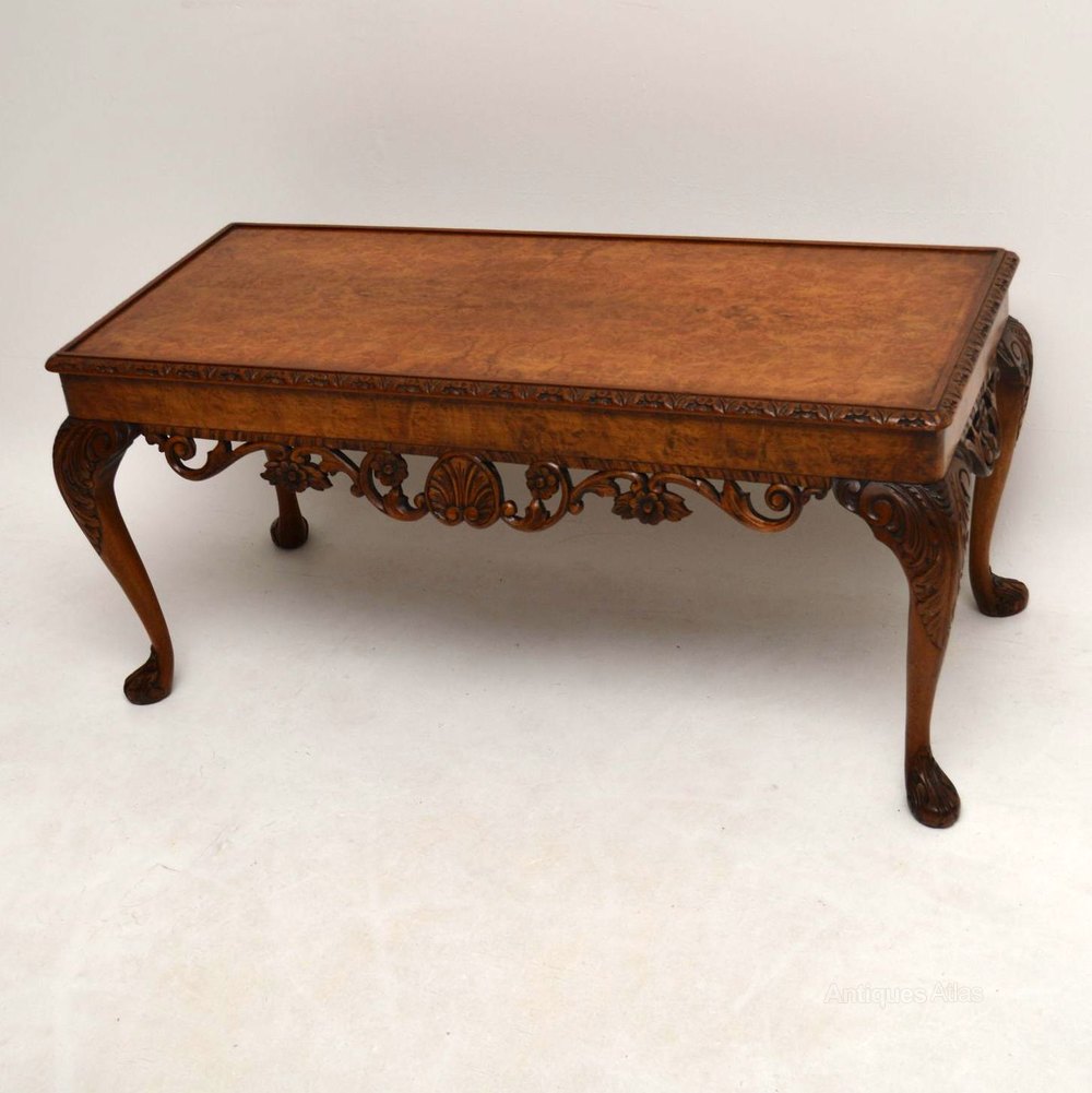Good quality antique walnut coffee table in excellent condition & dating from around the 1930's period. The carving on this table is superb, especially between the legs. The table top & border are burr walnut & the legs are solid walnut. There is also a glass top which is bevelled, but this is not showing in the images.
