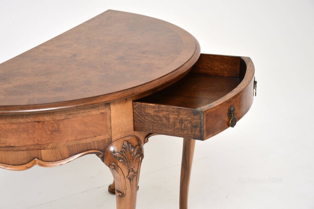 It is of wonderful quality and is a very useful size. This has gorgeous burr walnut grain patterns and colour tones, the bow fronted top has a nicely cross banded edge. The drawer and sides are also cross banded, the drawer has beautiful brass handles and fine, hand cut dovetailed joints. This stands on cabriole legs with crisp shell carving at the knees.