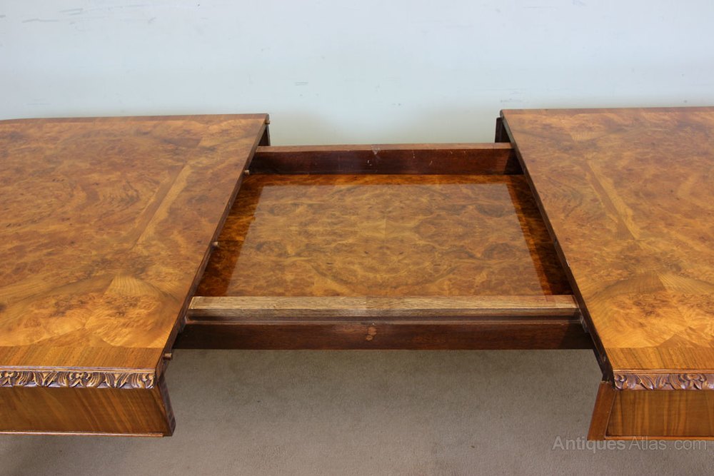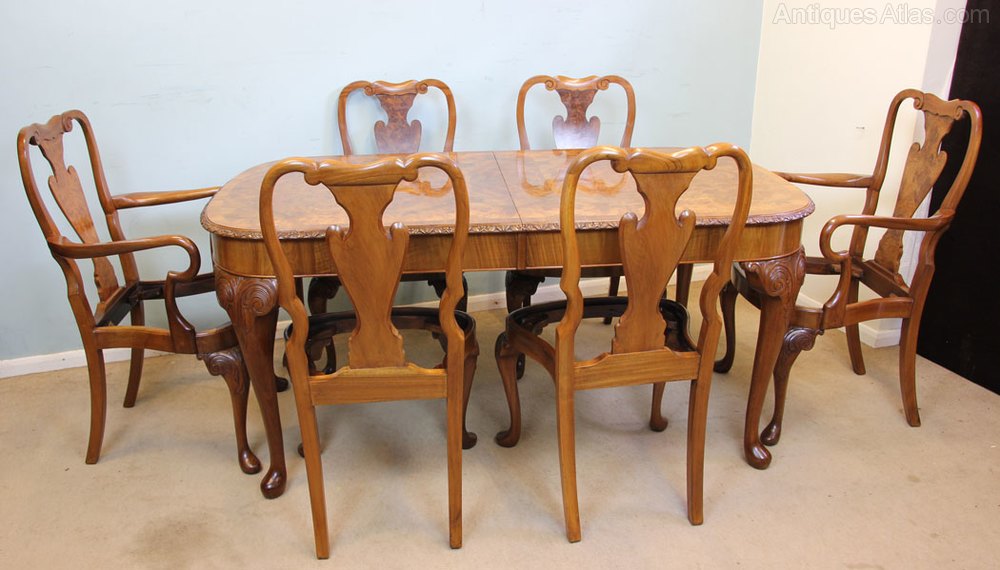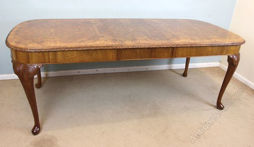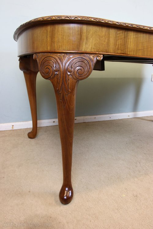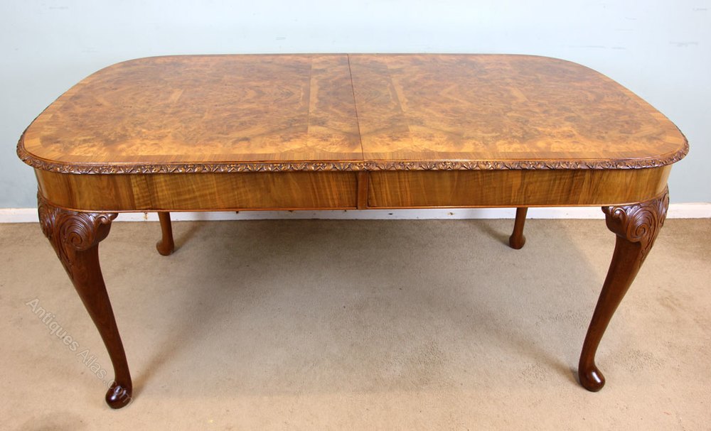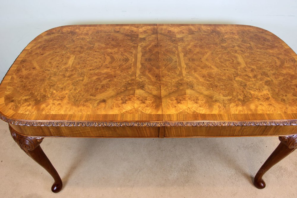 Antique Queen Anne style 20th century burr walnut D end extending dining table to seat eight people having wonderful burr walnut top with carved edge having skirt under all supported by Queen Anne style legs with carved decoration. The table has one extending leaf which stores under the table when not being used,