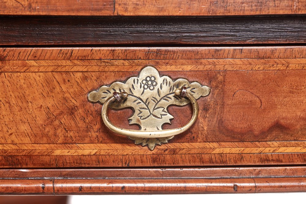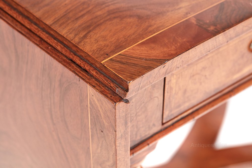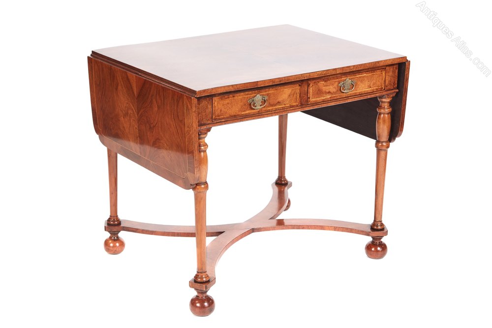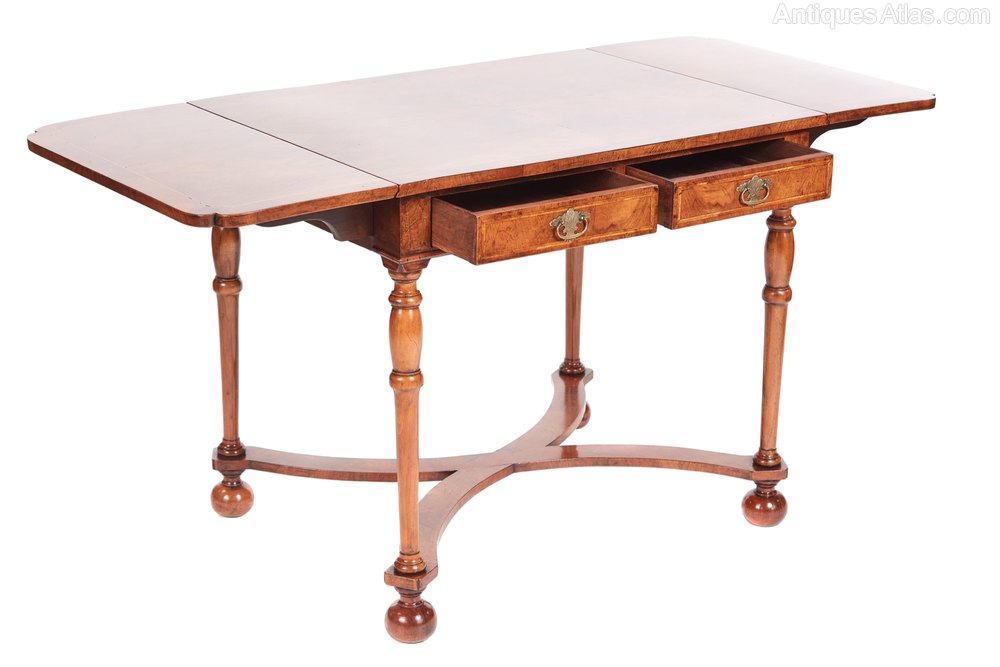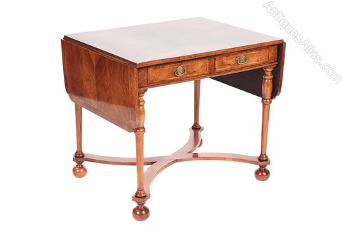 Antique burr walnut freestanding sofa table, having a lovely burr walnut top with satinwood inlay and two drop leaves, two frieze drawers and two dummy drawers to the back original brass handles, supported by four turned solid walnut legs with ball feet united by a shaped crossed stretcher.