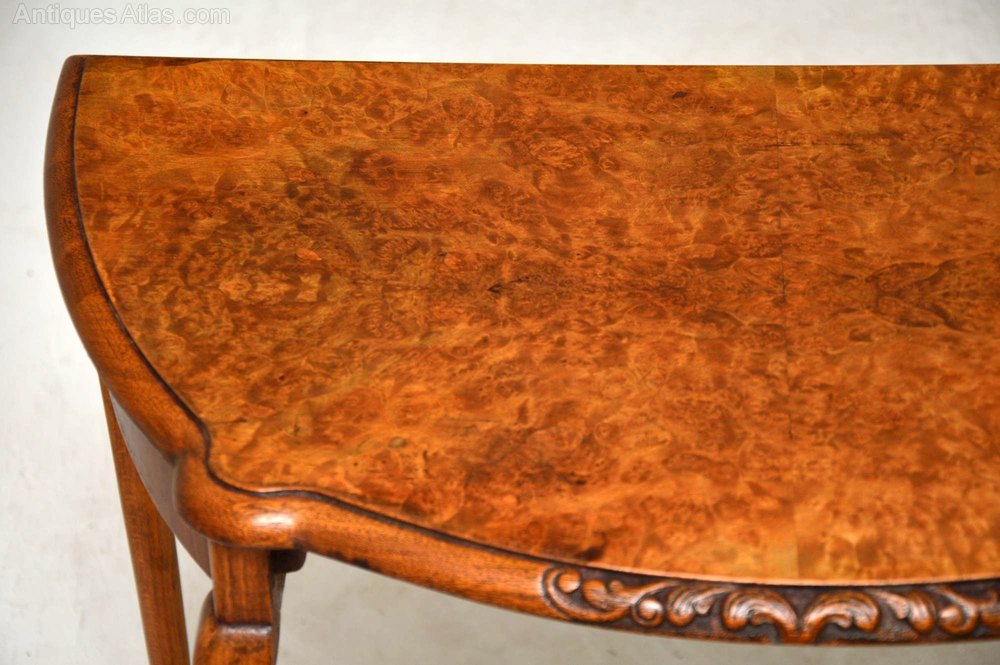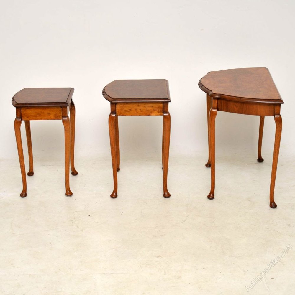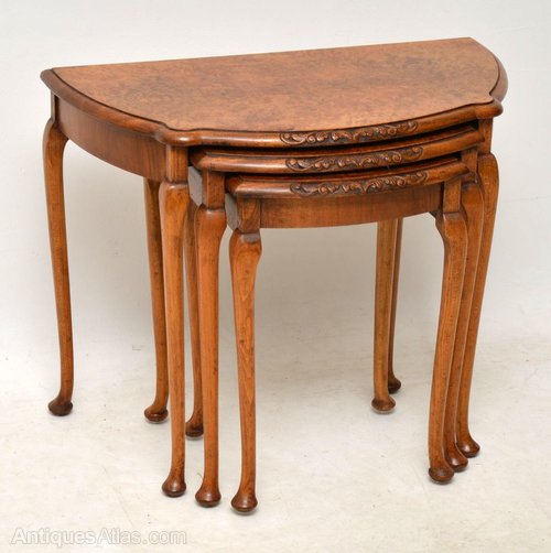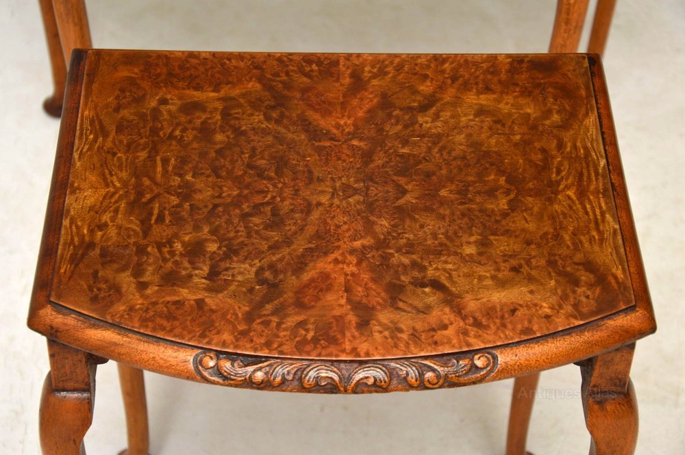 This antique walnut nest of antique tables are slim from back to front, so they will work well in a confined space. They are in excellent condition & date from around the 1930’s period. The shaped tops are burr walnut & they have fine carving on the fronts.