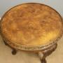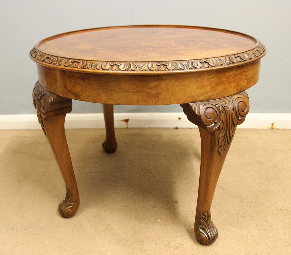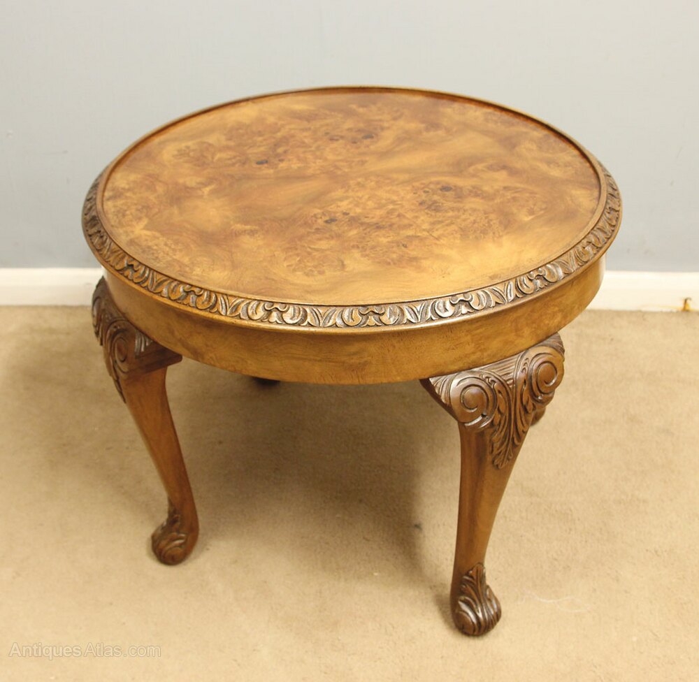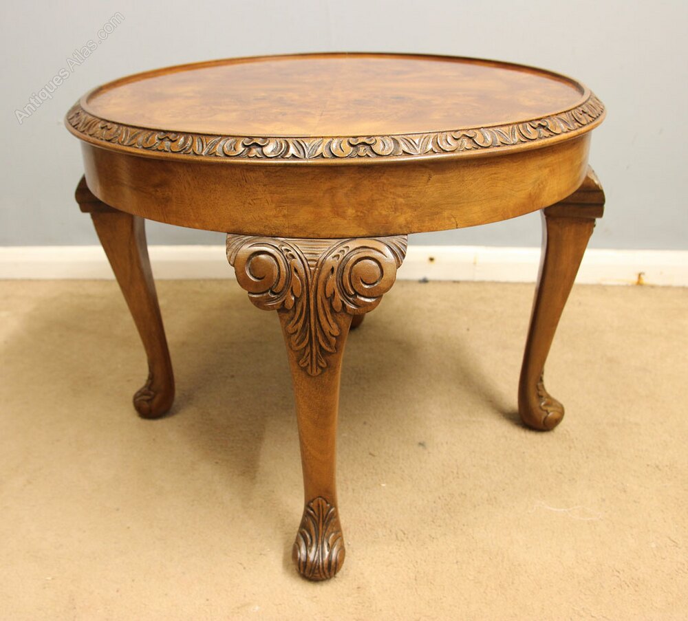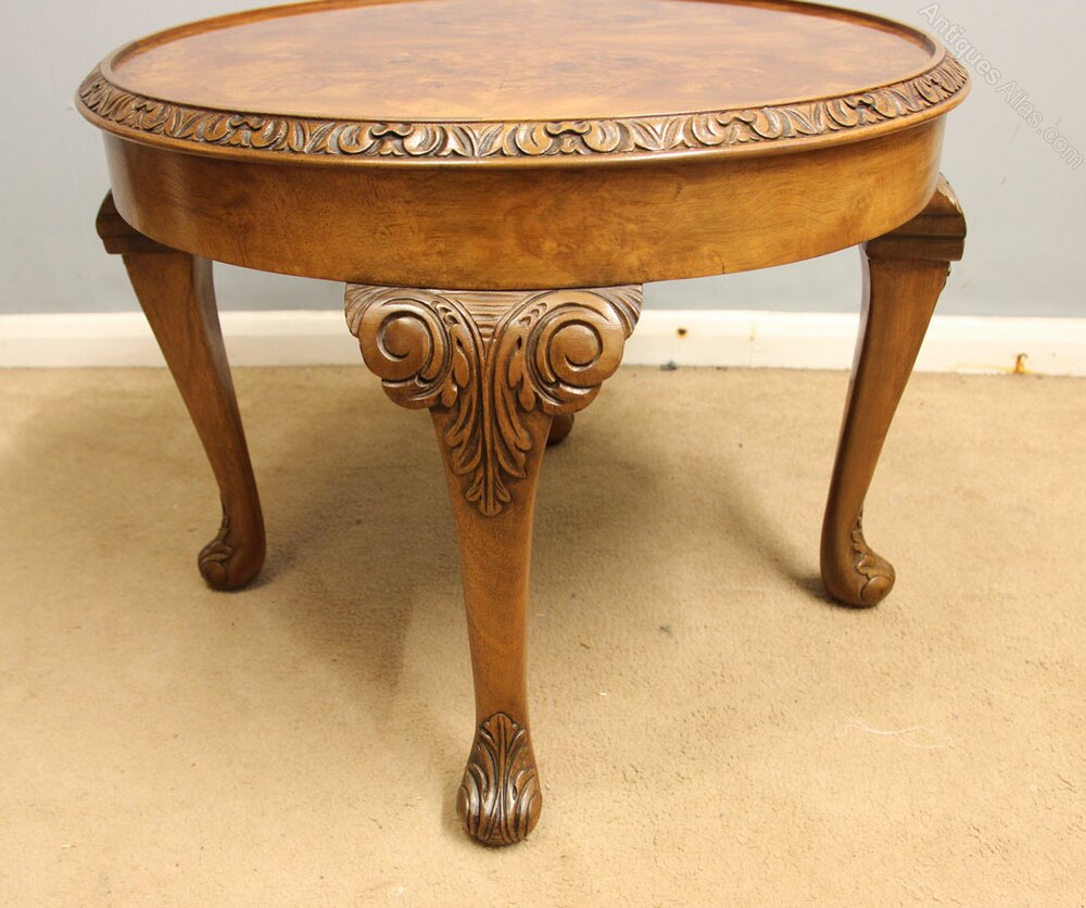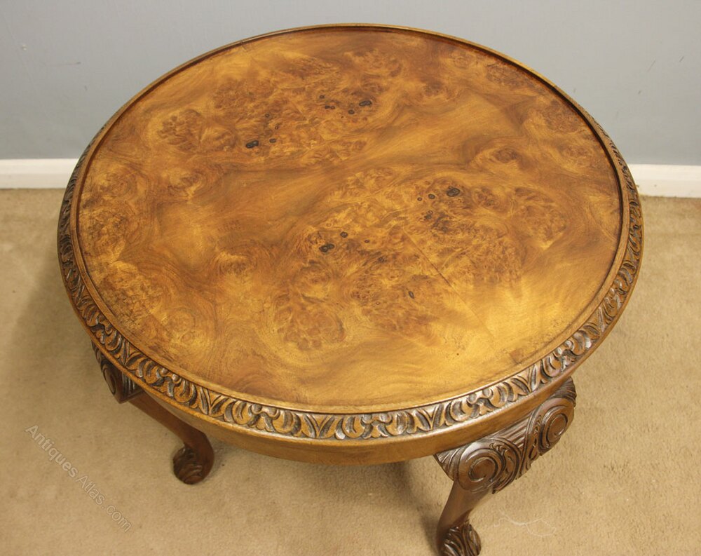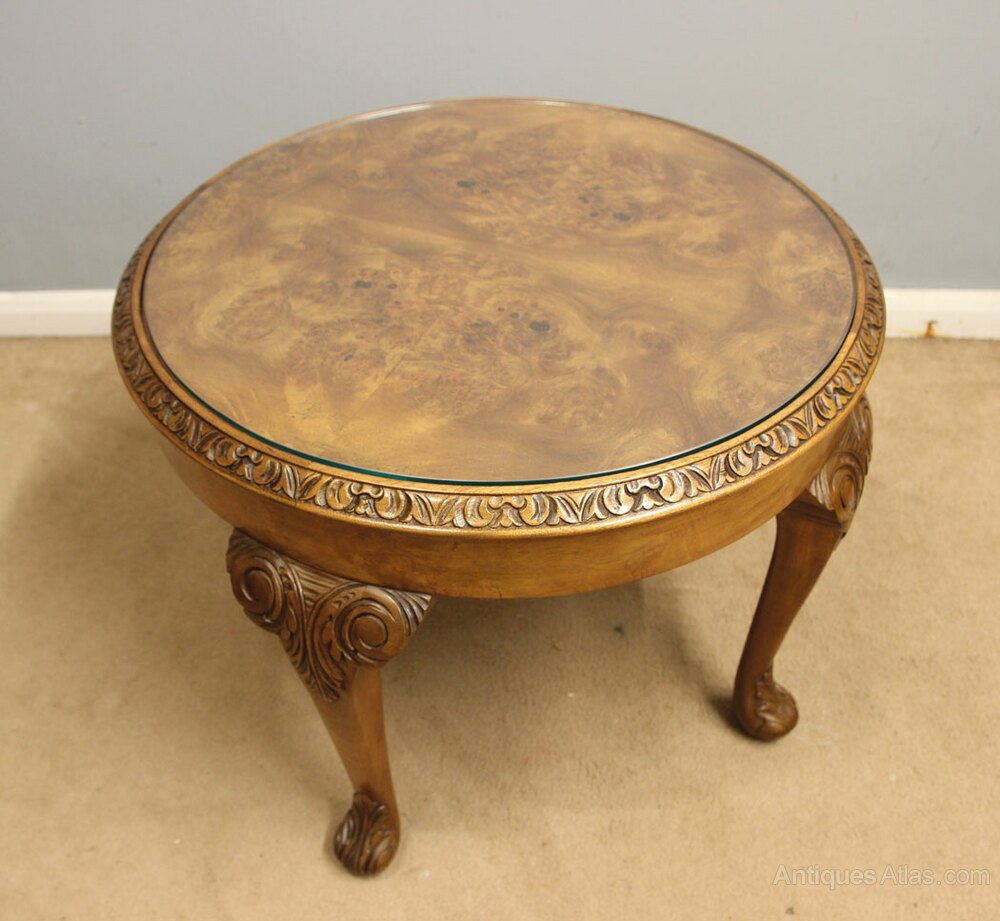 Antique Burr Walnut Coffee Table, This burr walnut round coffee / occasional table has a lovely burr walnut top with carved edge under having figured walnut skirt all supported by queen anne style legs with carved decoration, The table has a glass top.