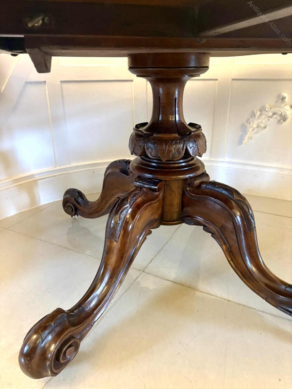 The table is supported on a boldly carved central pedestal base, enriched with acanthus-style carving and terminating in sweeping scroll feet. This substantial pedestal provides excellent stability while allowing generous legroom, making the table both practical and visually impressive.