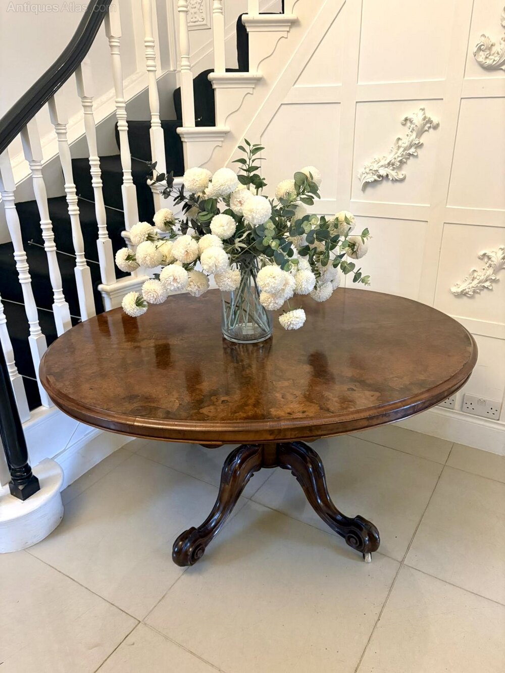 Very good antique condition. The burr walnut top retains a warm colour and attractive patina, with light surface marks and gentle wear consistent with age and use. The pedestal base is solid and sturdy, with crisp carving and no structural concerns.