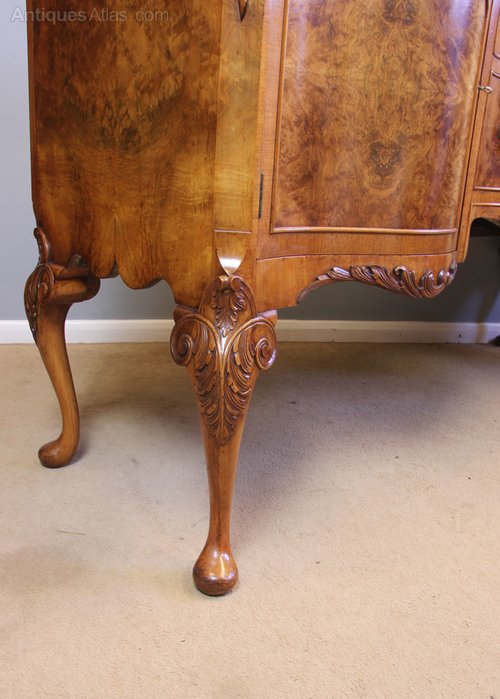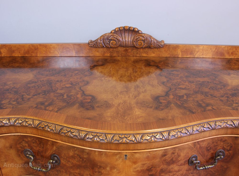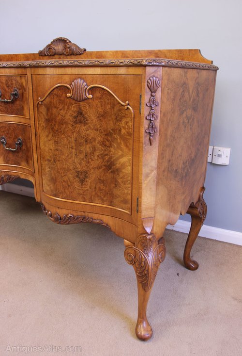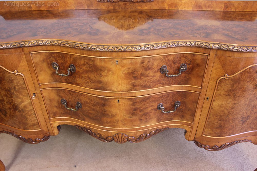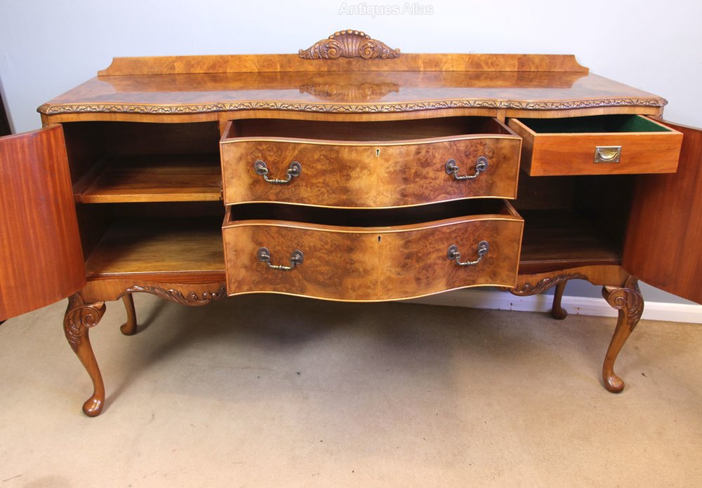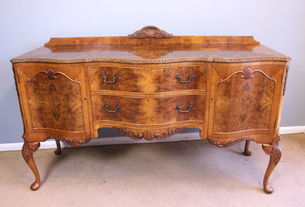 Antique Quality Burr Walnut Serpentine Front Sideboard. This beautiful burr walnut sideboard has a low shaped upstand to the back with carved detail to the centre having a superb shaped burr walnut top with crossbanded edge and lovely carved detail. The wonderful serpentine front having two drawers to the centre with carved shaped frieze under flanked either side by lovely serpentine shaped doors having shaped burr walnut panel with carved shell moulding edge with cross banding with shaped and carved frieze under. The cantered corners have carved detail to the top and all supported by lovely carved elegant legs. The sides of the sideboard are also finished in lovely burr walnut with shaping below. The interior of the cupboard have baize lined drawer and storage below to the right hand side the left hand cupboard has single shelf.