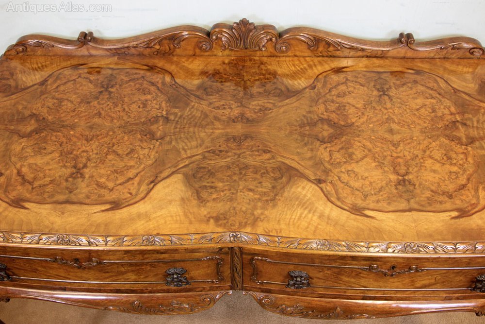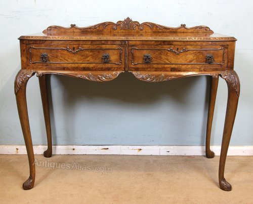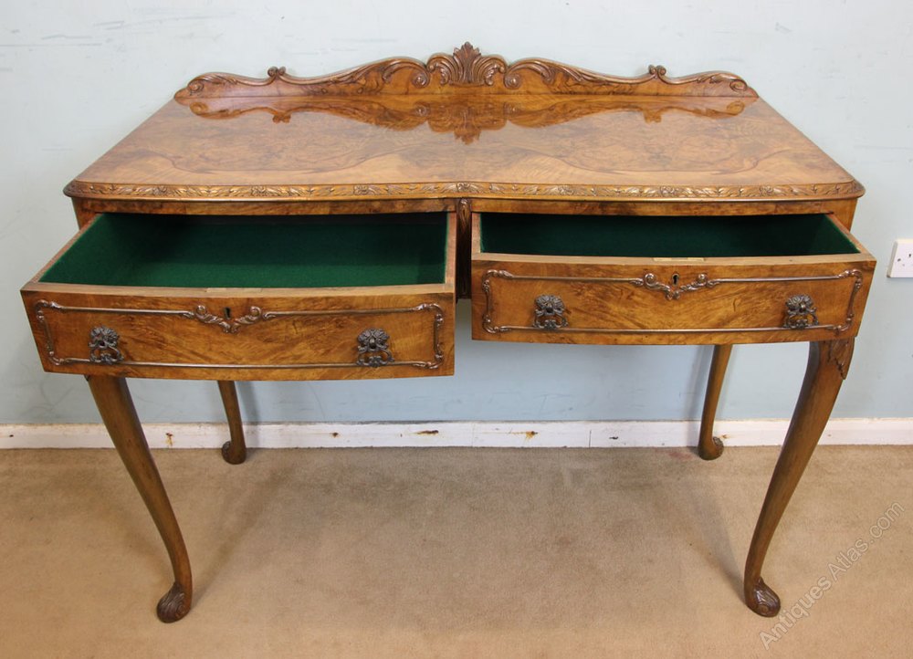 Antique Walnut Two Drawer Side Table, This antique burr walnut side / serving table has a carved and shaped up stand to the back with a lovely burr walnut shaped top with a carved edge. Under there are two drawers having figured walnut drawer fronts and decoctive mouldings. The side table is supported by queen anne style legs with carved detail