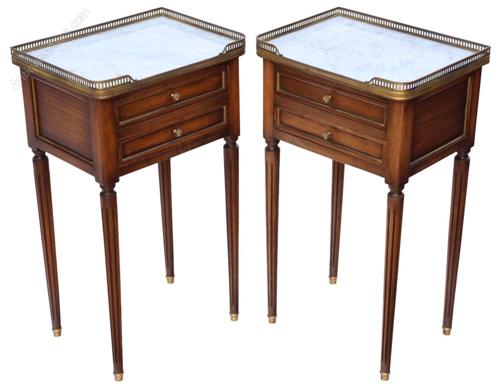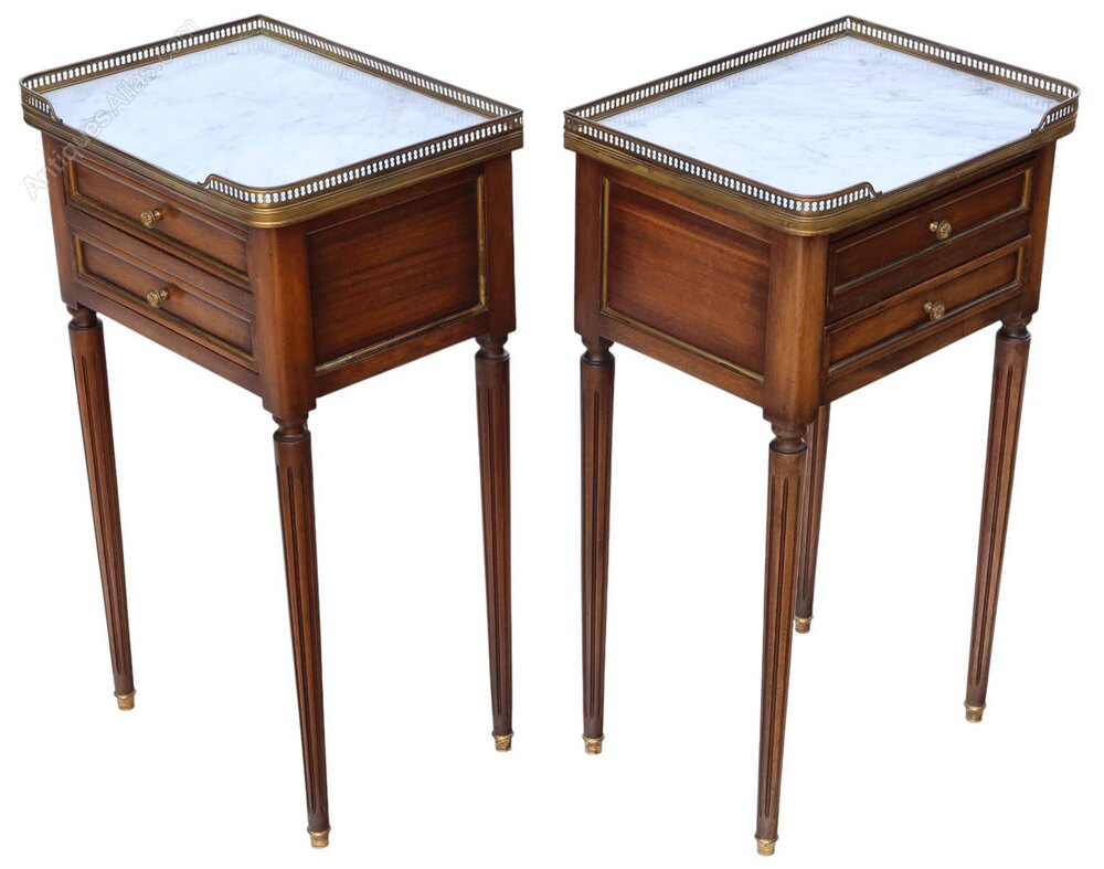 A fine opportunity to acquire a matching pair of c.1925 mahogany and marble bedside tables, combining practical design with decorative charm. Sale up to 30% off marked prices
