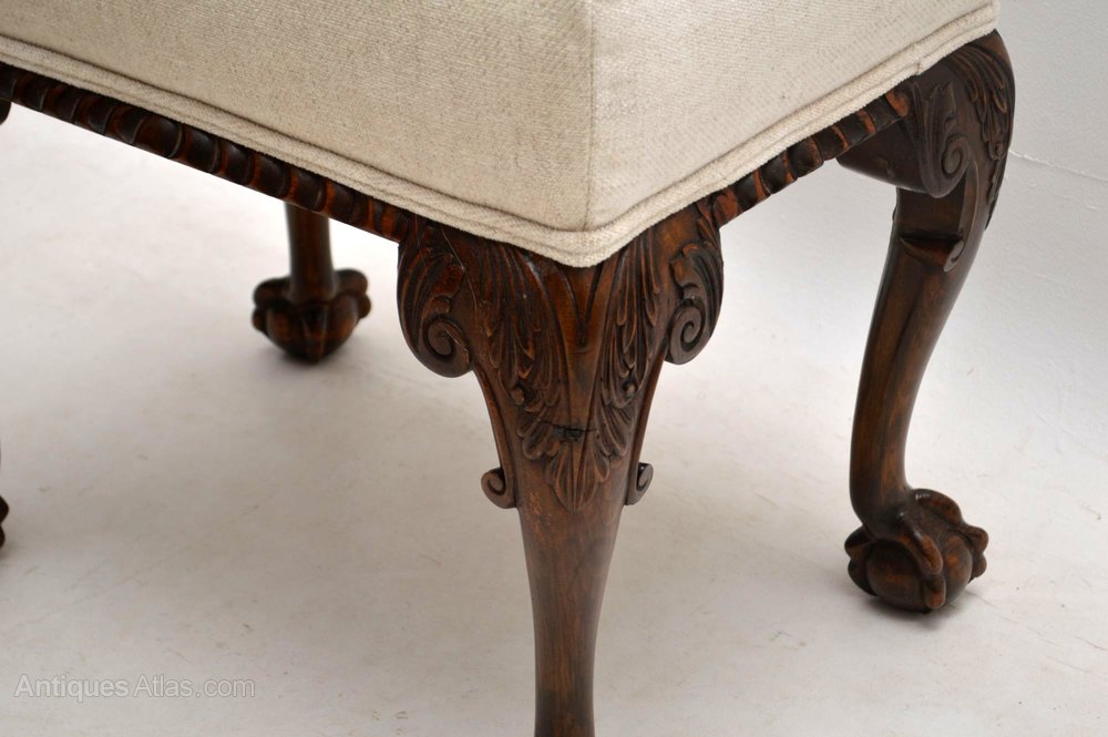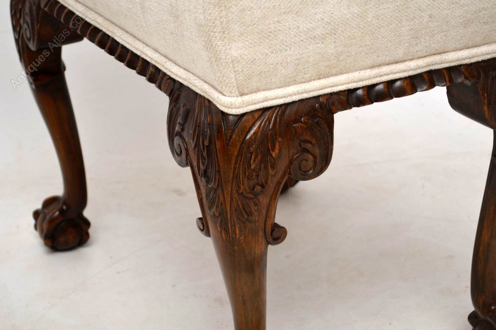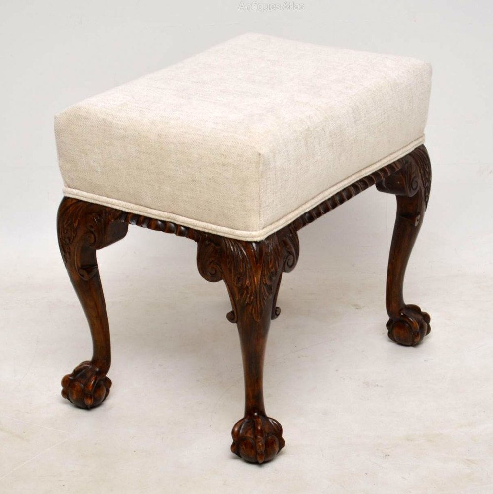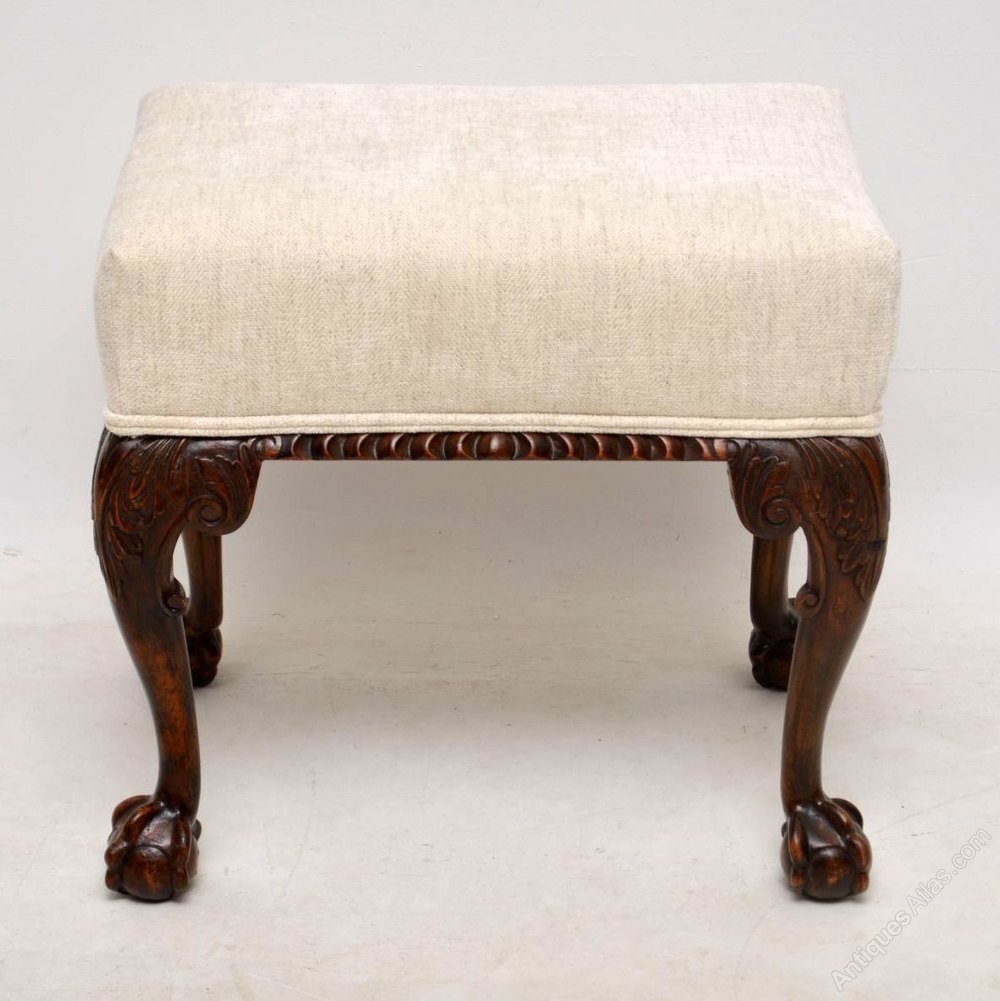 This antique mahogany upholstered stool dates from around the 1890’s period & is designed very much in Chippendale manner. It’s beautifully carved around the seat & on the legs which have claw & ball feet. This stool is in very good condition & has a nice naturally aged look on the wood. We have just had it re-upholstered in a grayish cream fabric.