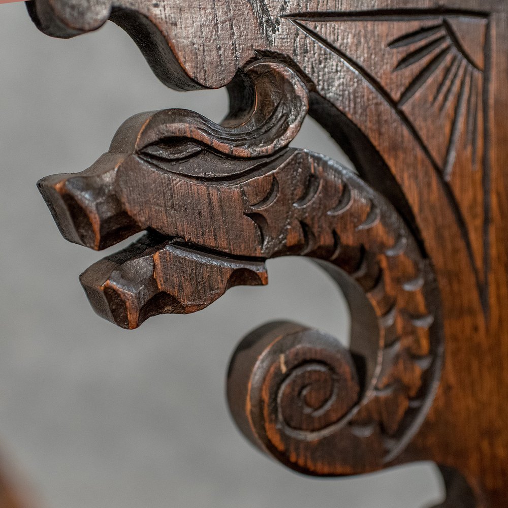 A fine back is profusely carved and pierced with mythical beasts and foliate form, affording a touch of class to this most practical of items