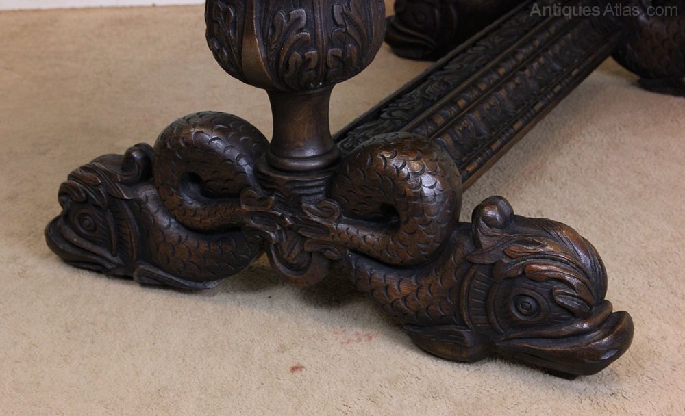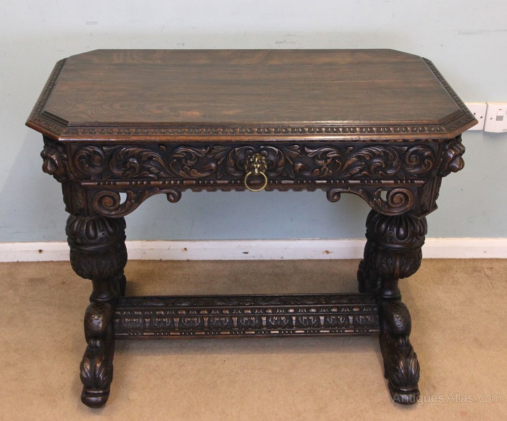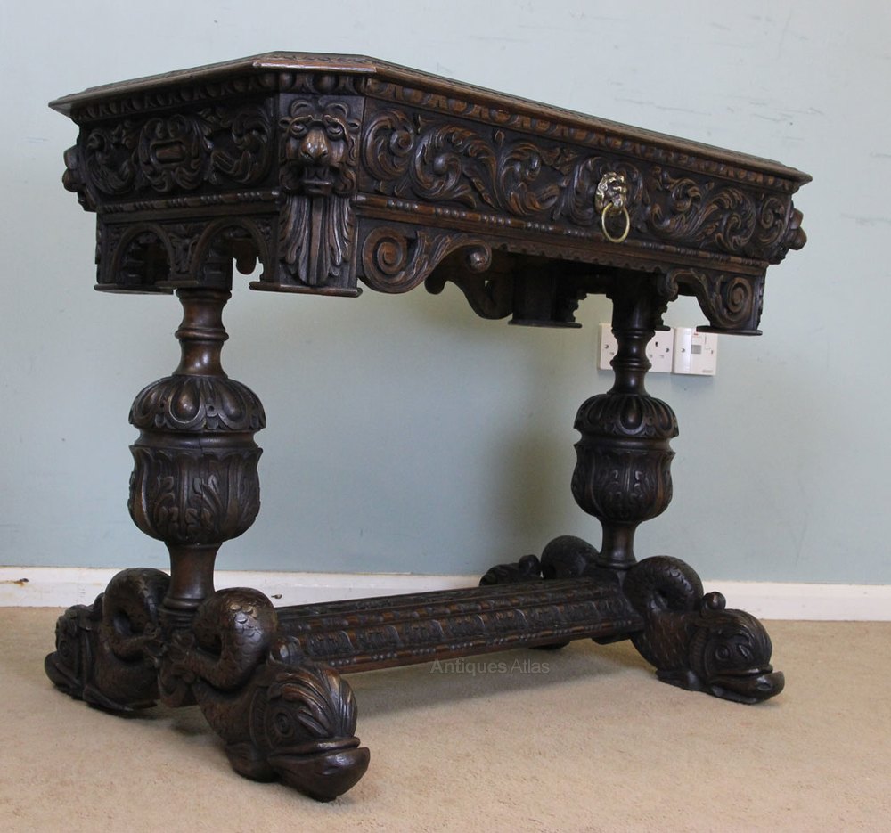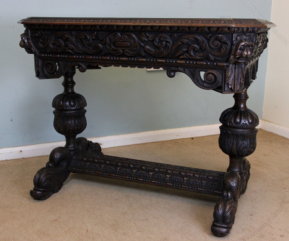 Antique carved oak side table / writing table having a rectangular top with lovely carved decoration under with single drawer. The table is supported by bulbous turned and carved end supports with carved dolphin legs united by centre stretcher the carved decoration is all around so is perfect to stand in the centre of a room. Circa 1900