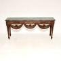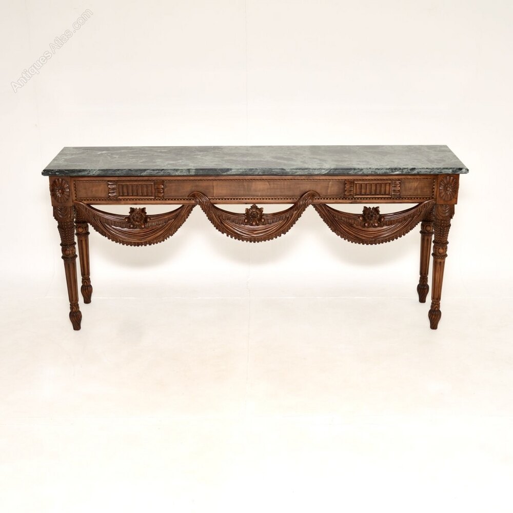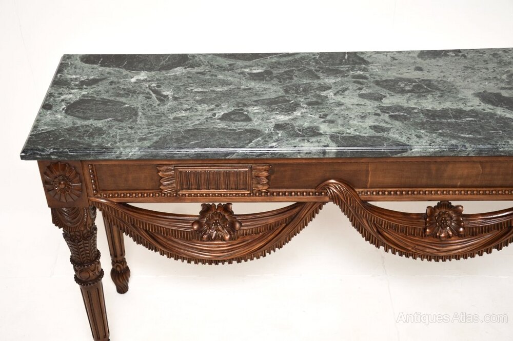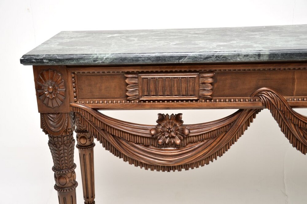 It is of outstanding quality, there is profuse carving throughout with wonderful details. The front edge has beautiful sweeping swags, with floral carving and beading throughout the whole frame. This has an amazing and very heavy green marble top with a thumb grooved edge, the top lifts off and comes separately for ease of transport.