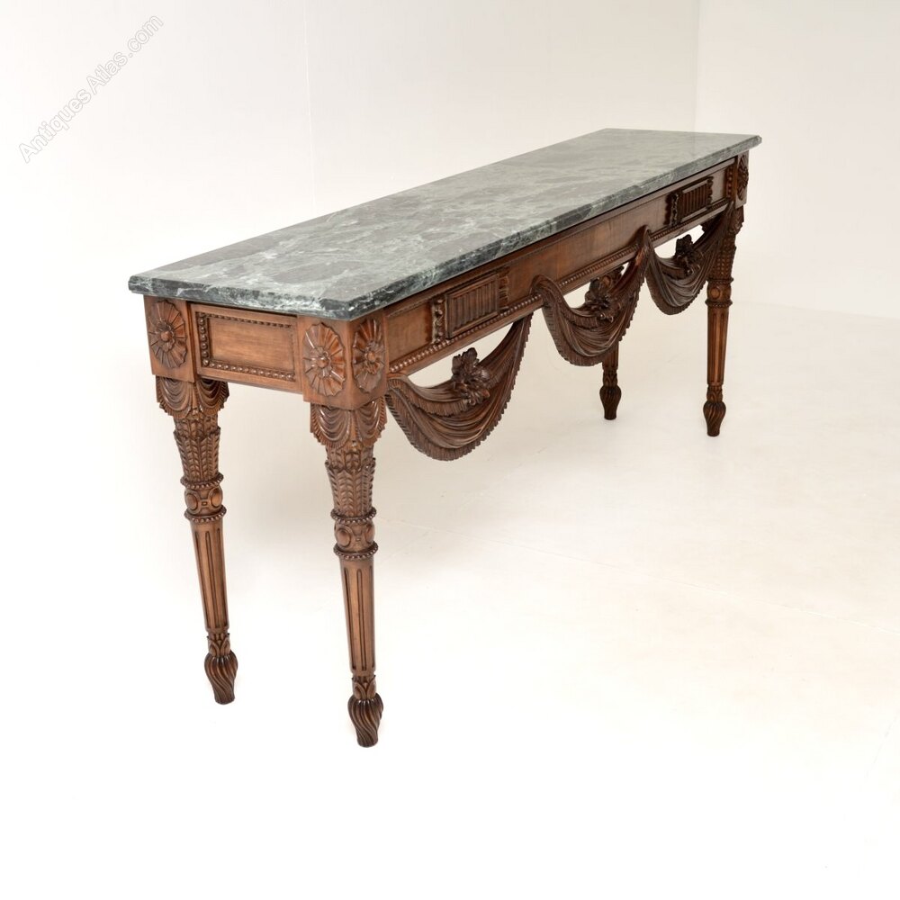 A spectacular antique carved solid walnut marble top console table. It is in the Victorian style, this was made in England and dates from around the 1930-50’s.