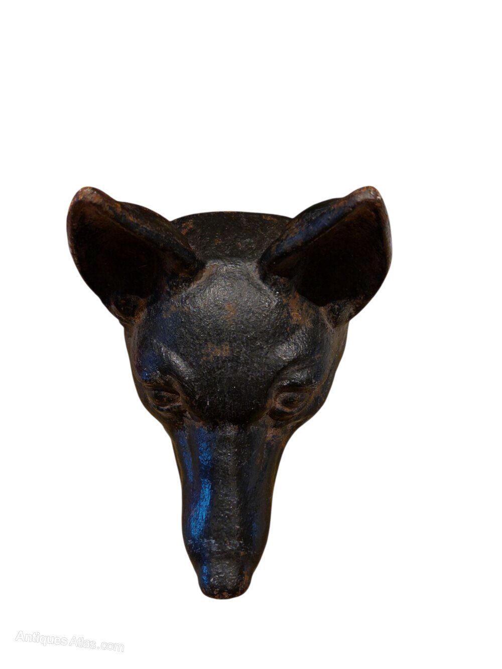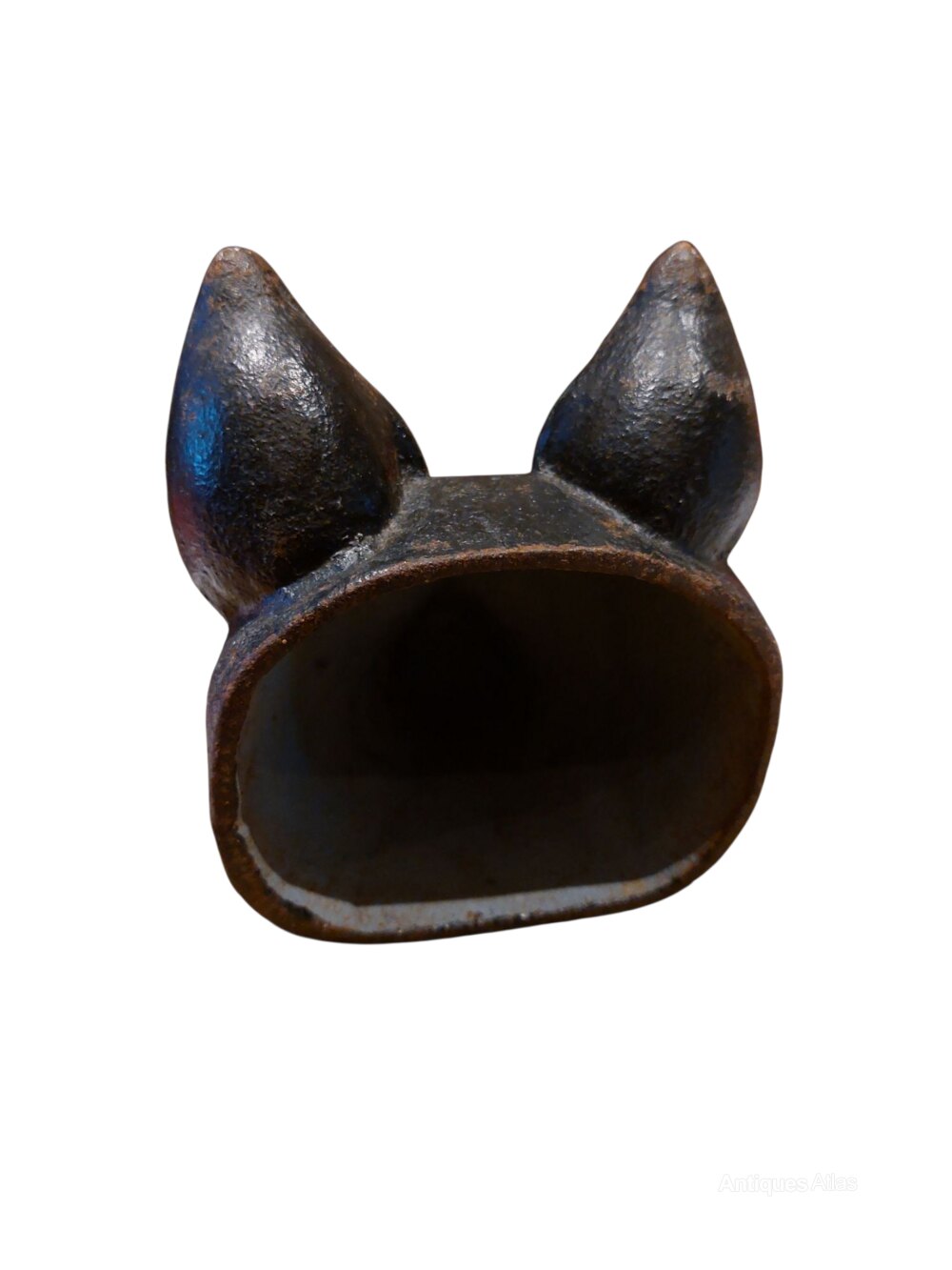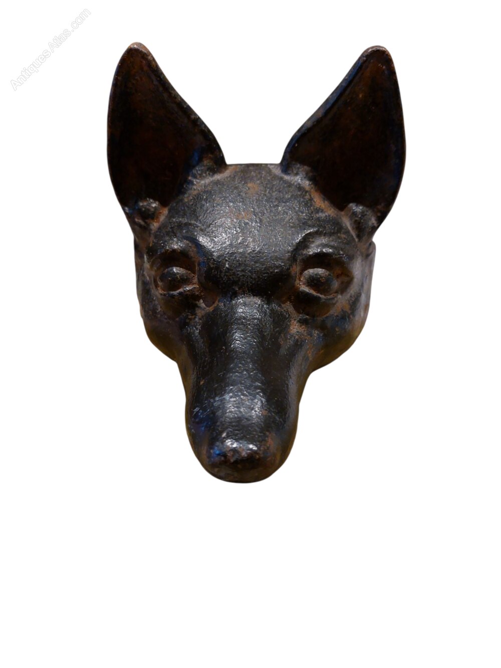 A good original country house Antique cast iron doorstop depicted as a fox head dating from the late 19th century. Meant to be placed with the snout pointing upwards and the ears outwards from the door. Nice and heavy and in sound used condition. 6" high x 5" wide x 6" deep.