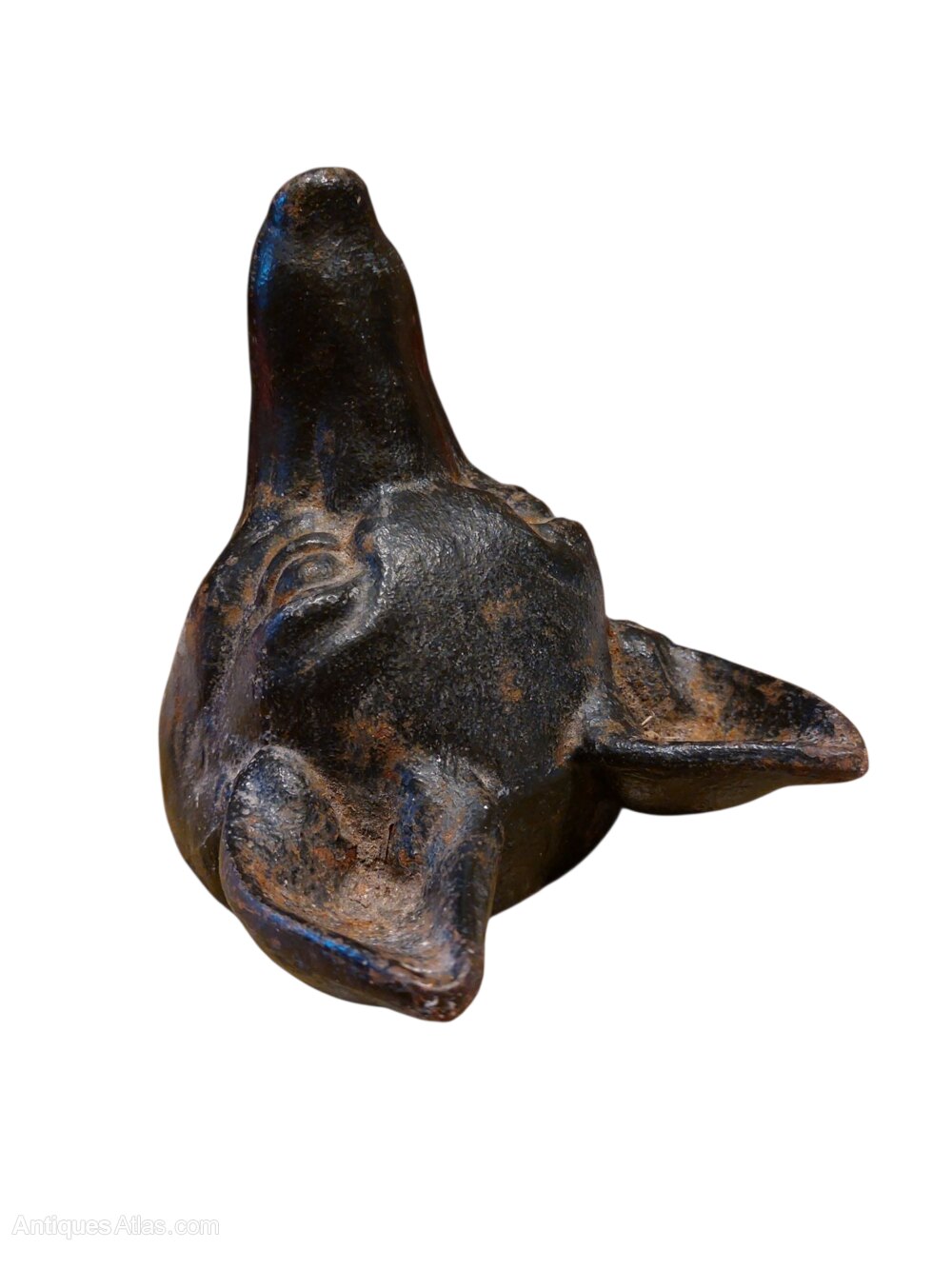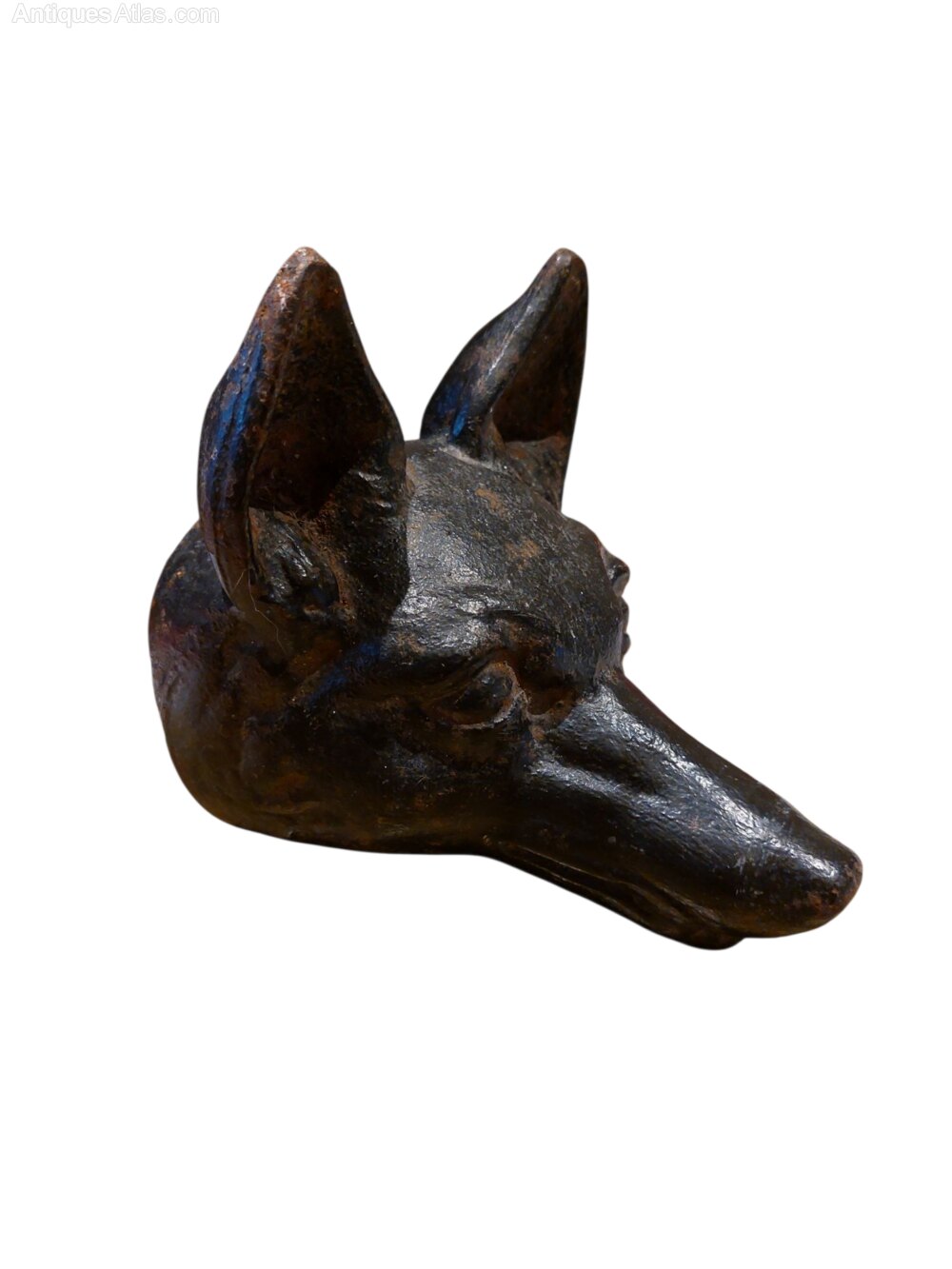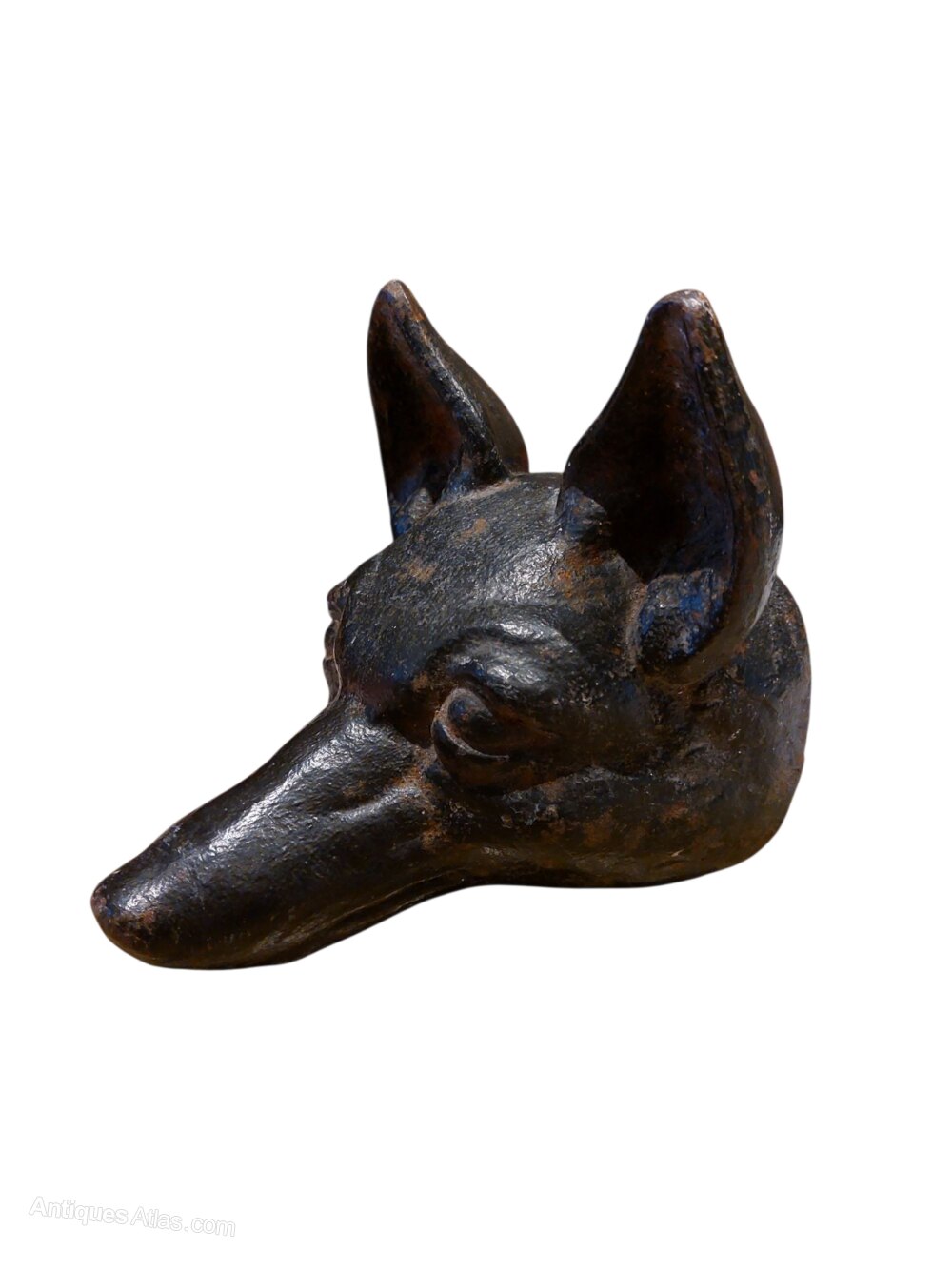 A good original country house Antique cast iron doorstop depicted as a fox head dating from the late 19th century. Meant to be placed with the snout pointing upwards and the ears outwards from the door. Nice and heavy and in sound used condition. 6" high x 5" wide x 6" deep.